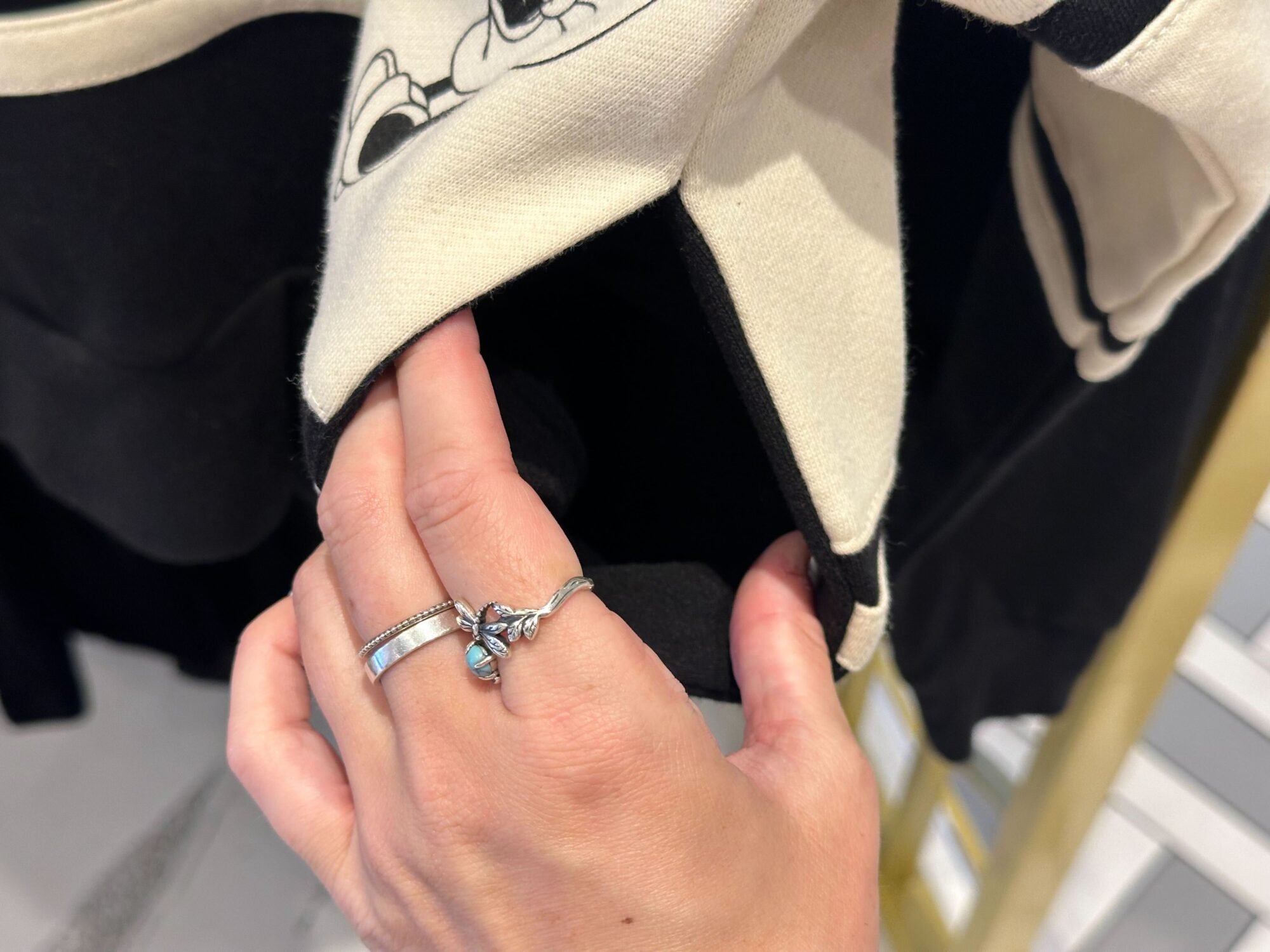 A hand wearing a silver band and a silver butterfly ring holds up a black and white piece of fabric with a cartoon eye design.