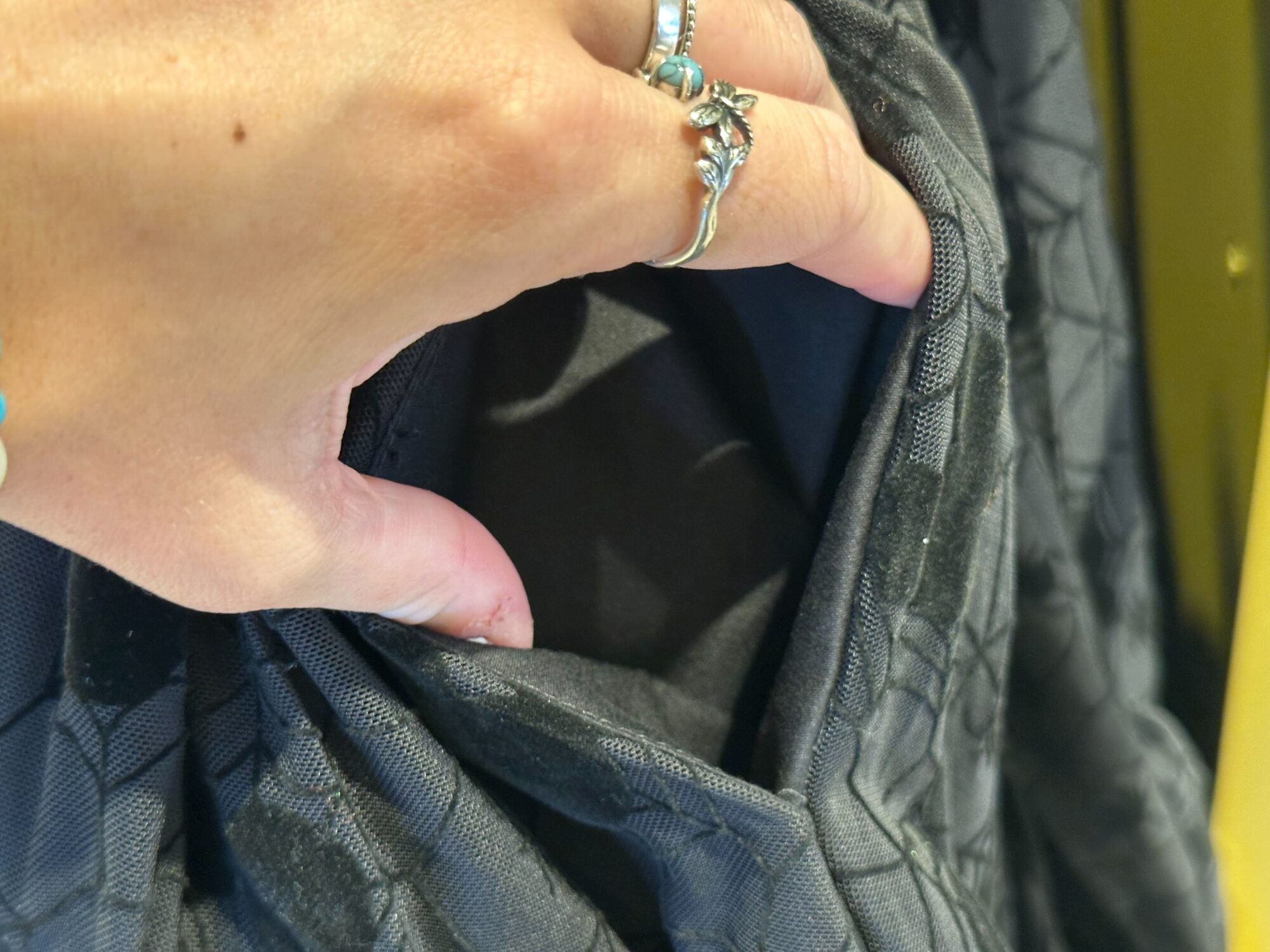 Close-up of a hand wearing multiple rings holding black fabric to show a hidden pocket inside a garment.