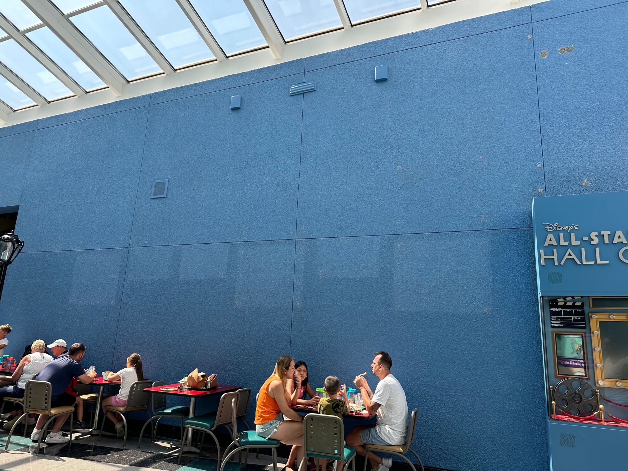 Several people are sitting and eating at tables in an indoor dining area with blue walls and a high glass ceiling.