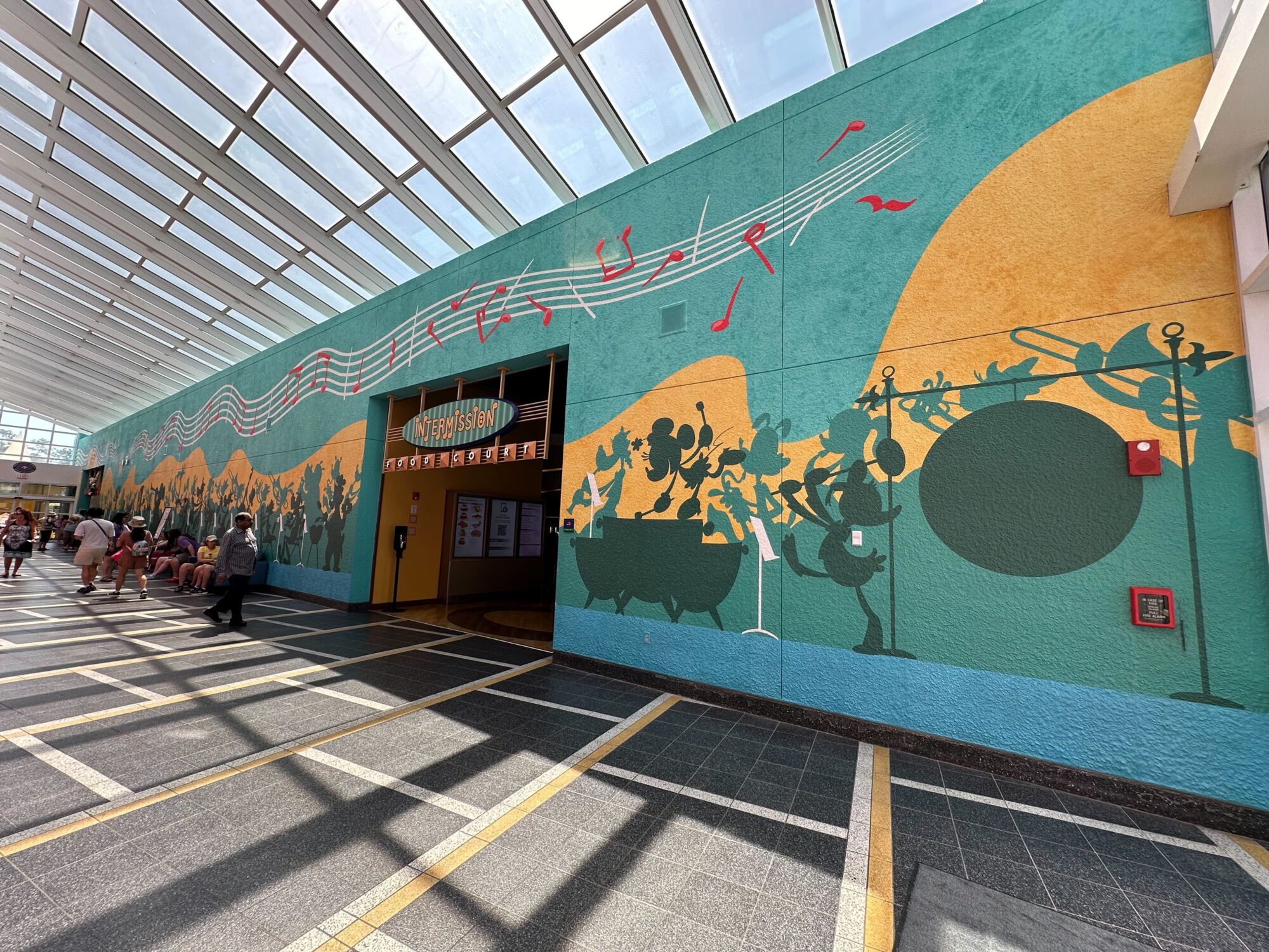 A brightly lit corridor features a colorful mural with musical notes and dancing figures, adjacent to the entrance of a food court. People walk and sit along the hallway.