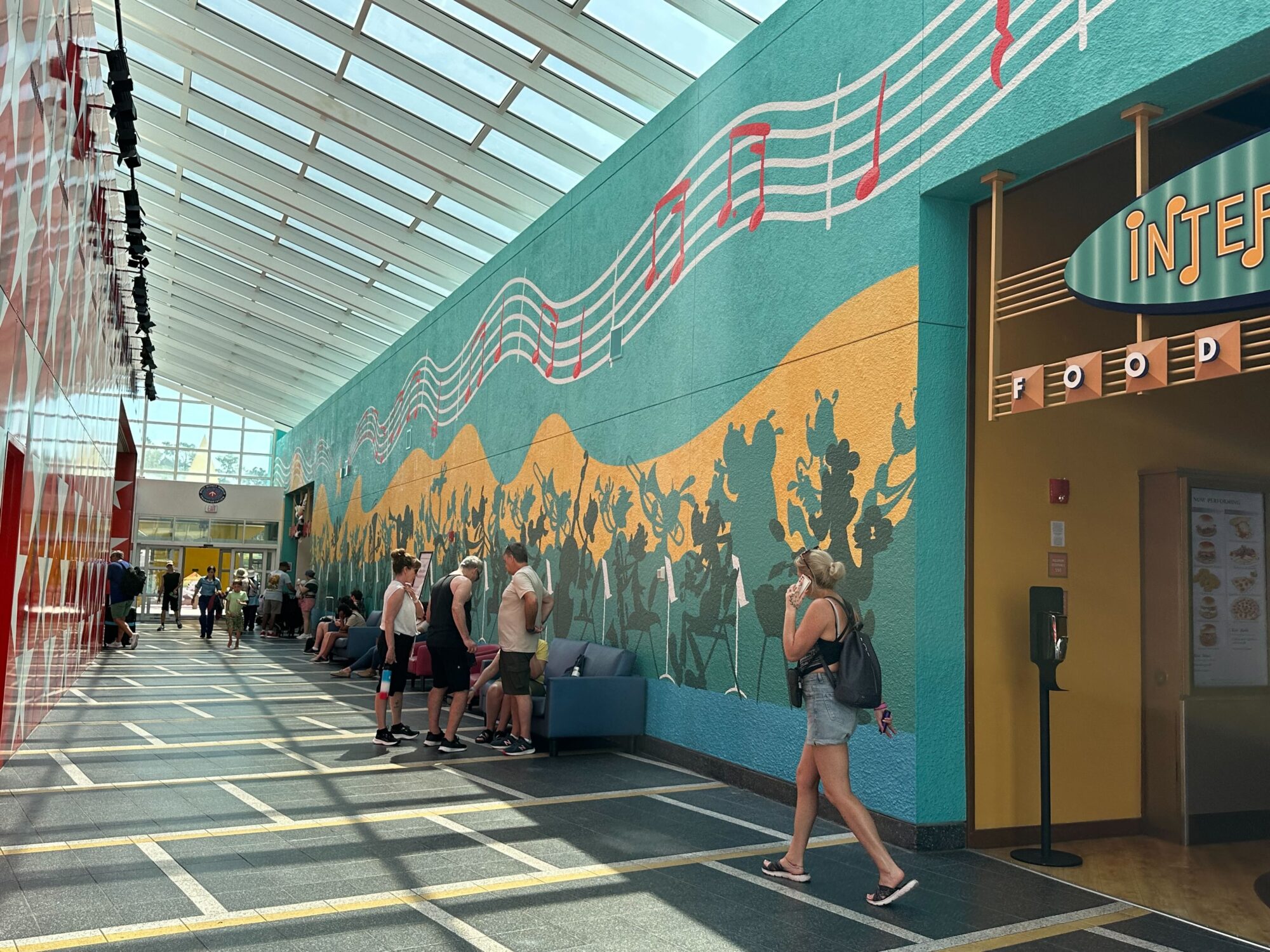 An indoor hallway with a high ceiling and large windows is decorated with a mural featuring musical notes and silhouettes of musicians. Several people are sitting and standing near the mural.