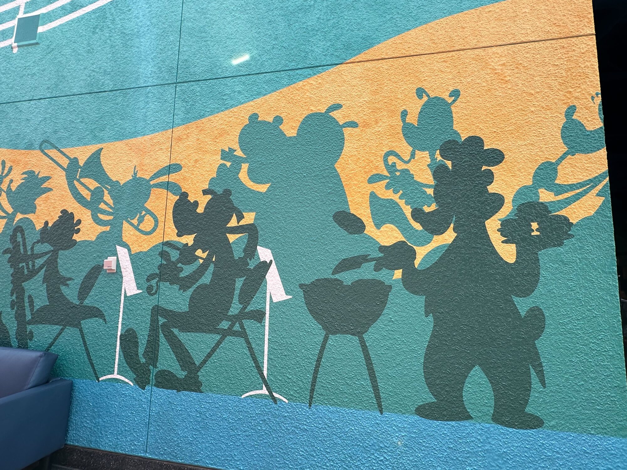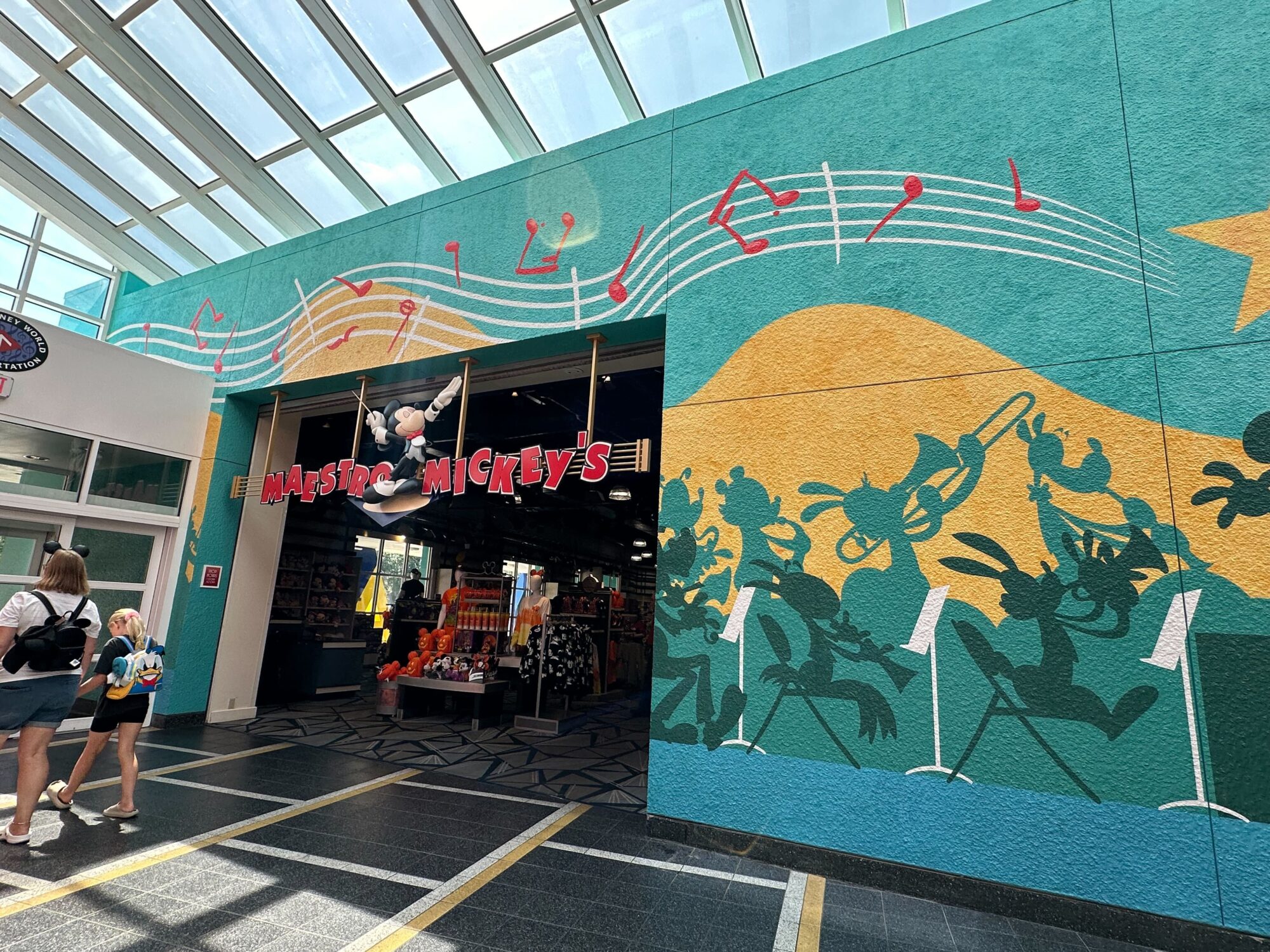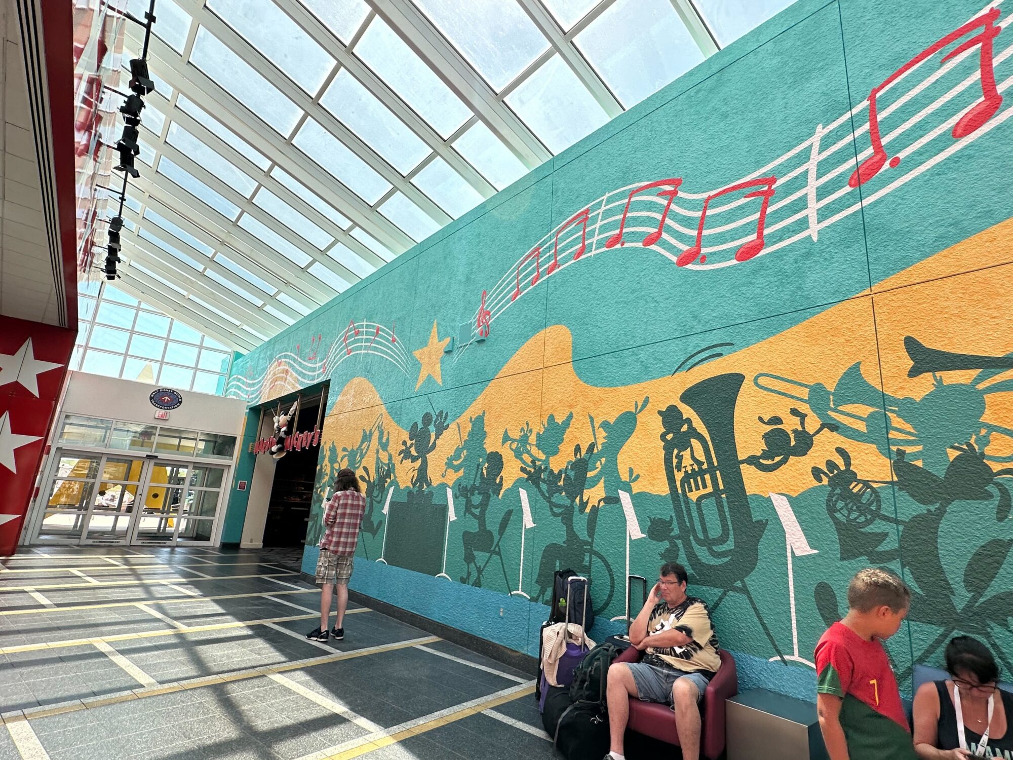 A colorful mural features silhouettes of Disney characters playing musical instruments on a teal and yellow background, with musical notes above them.