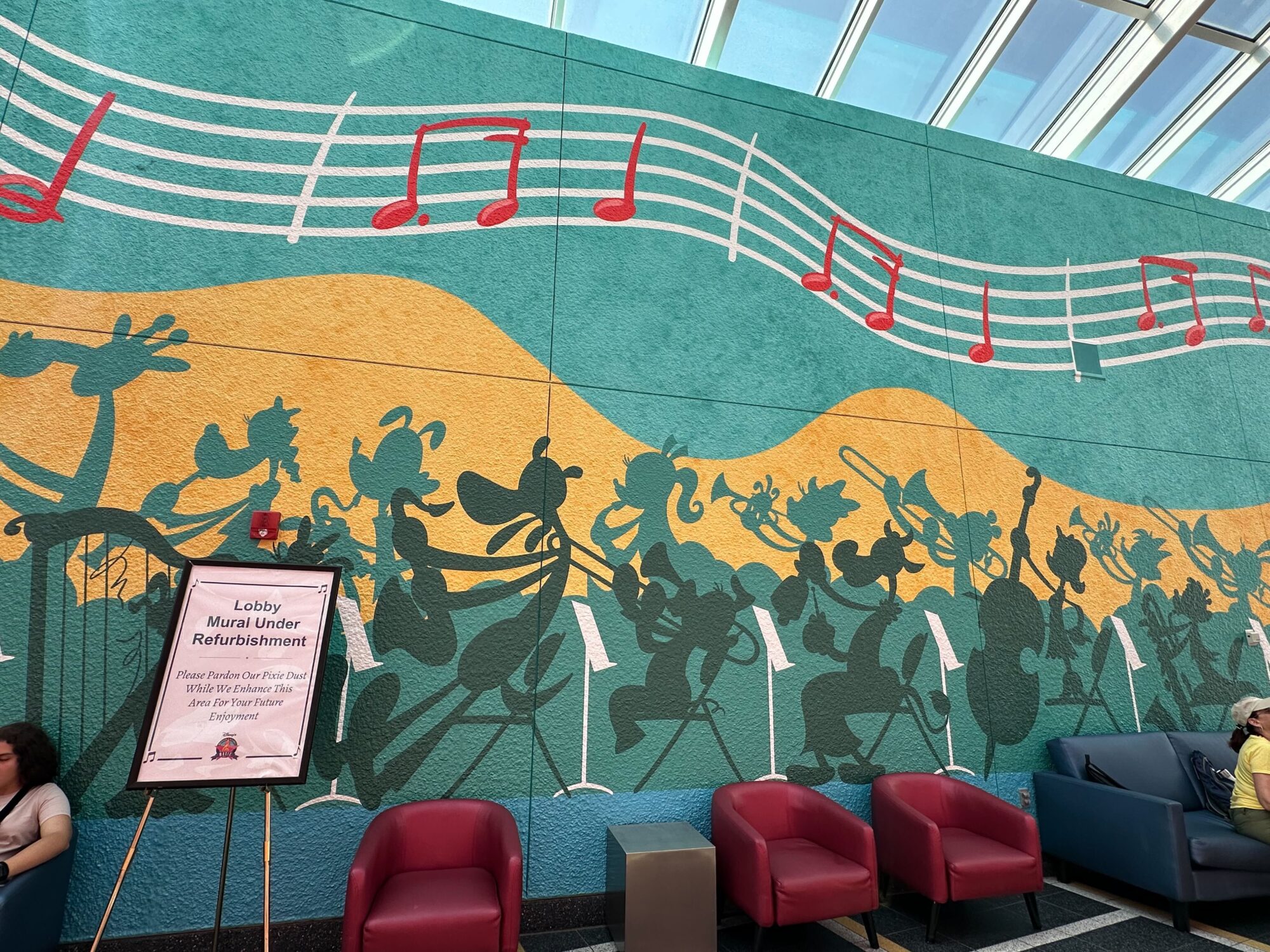A colorful mural featuring cartoon characters playing music instruments is seen on a wall. A sign in front reads, "Lobby Mural Under Refurbishment.