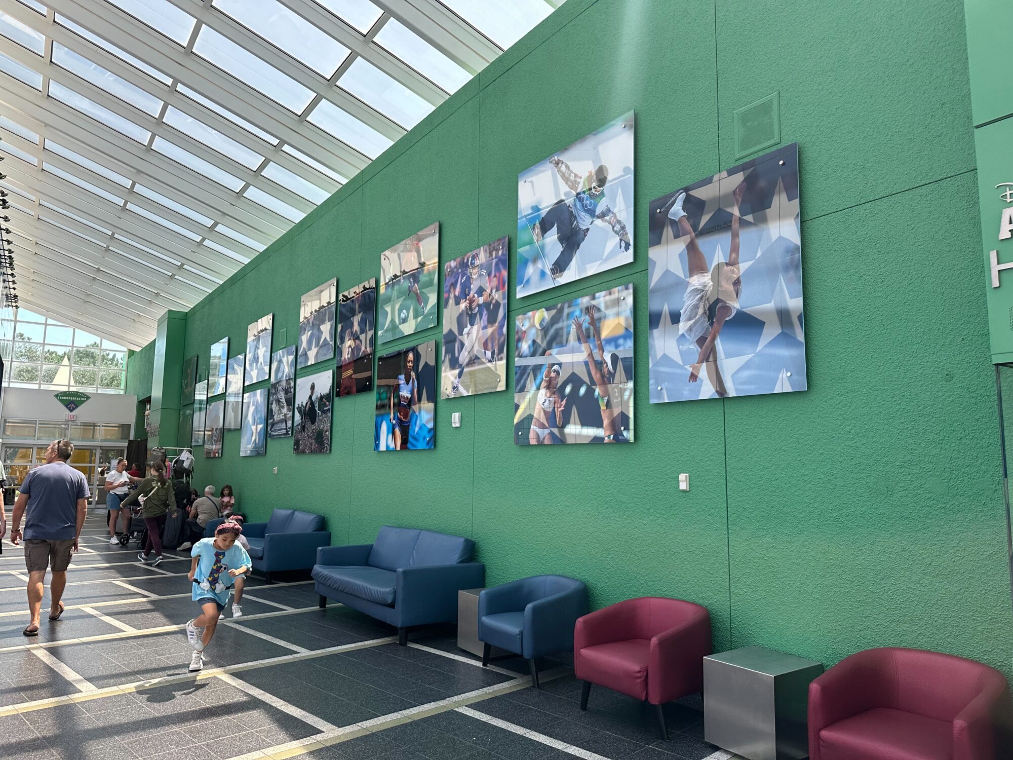 An indoor seating area with several photos of sports scenes on a green wall. Ceiling with multiple skylights allowing natural light. People sitting and walking.