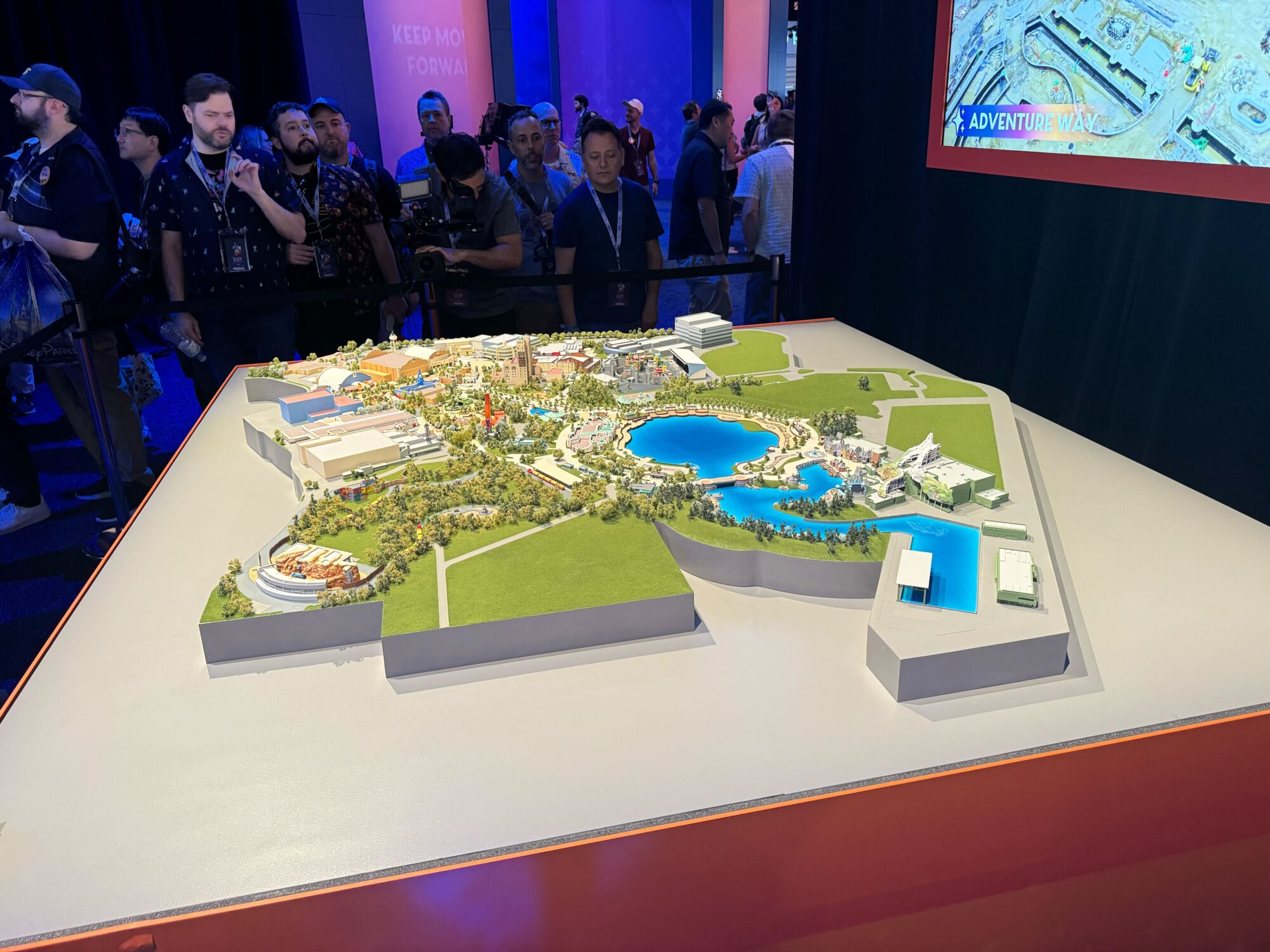 A detailed model of a theme park is displayed on a table. Several people stand around the exhibit, observing the model closely, in a well-lit room with blue and purple lighting.