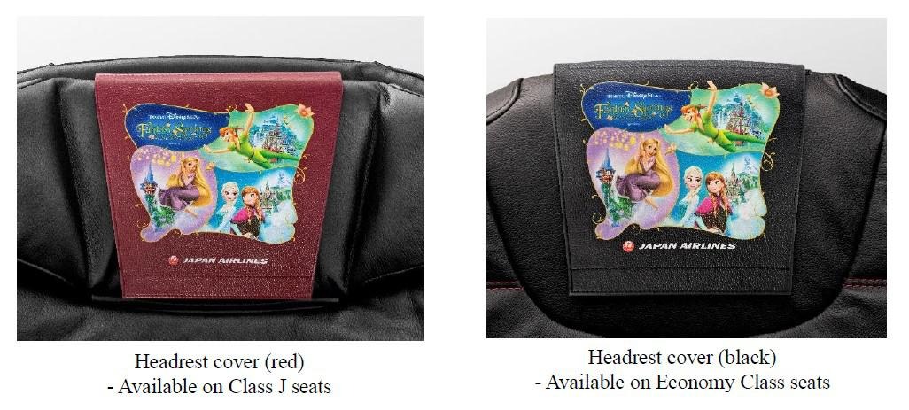 Two Japan Airlines seat headrest covers are shown: one red, available on Class J seats, and one black, available on Economy Class seats. Both feature Disney's "Frozen" artwork, offering a touch of Fantasy Springs magic to your airplane journey.
