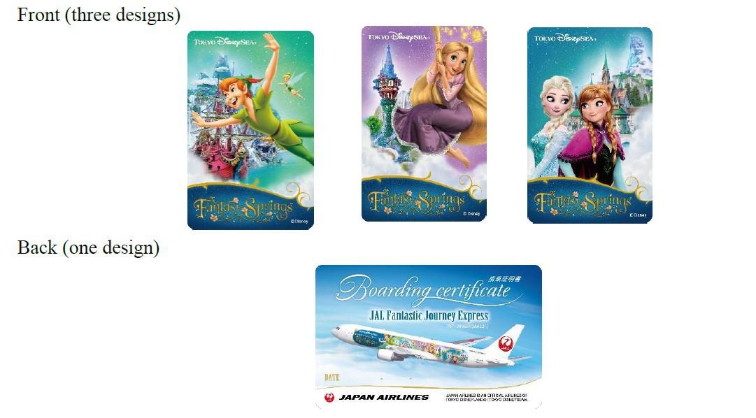 Image showing three themed boarding certificates from Japan Airlines featuring Disney characters on the front and a standardized design on the back, labeled "Boarding certificate JAL Fantastic Journey Express." Ideal for any Disney or airplane enthusiast, this collectible nods to Fantasy Springs magic.