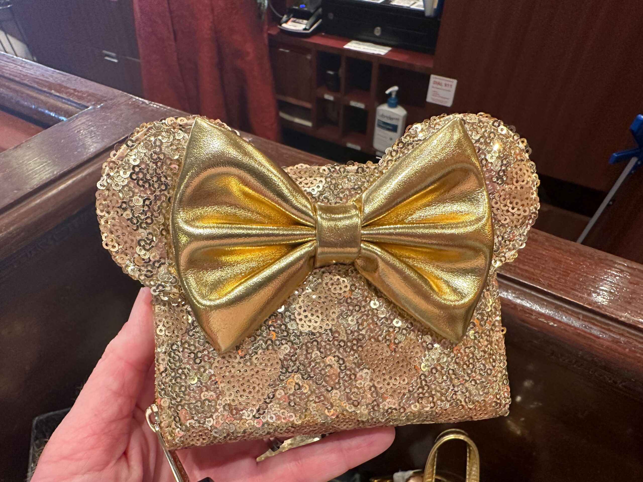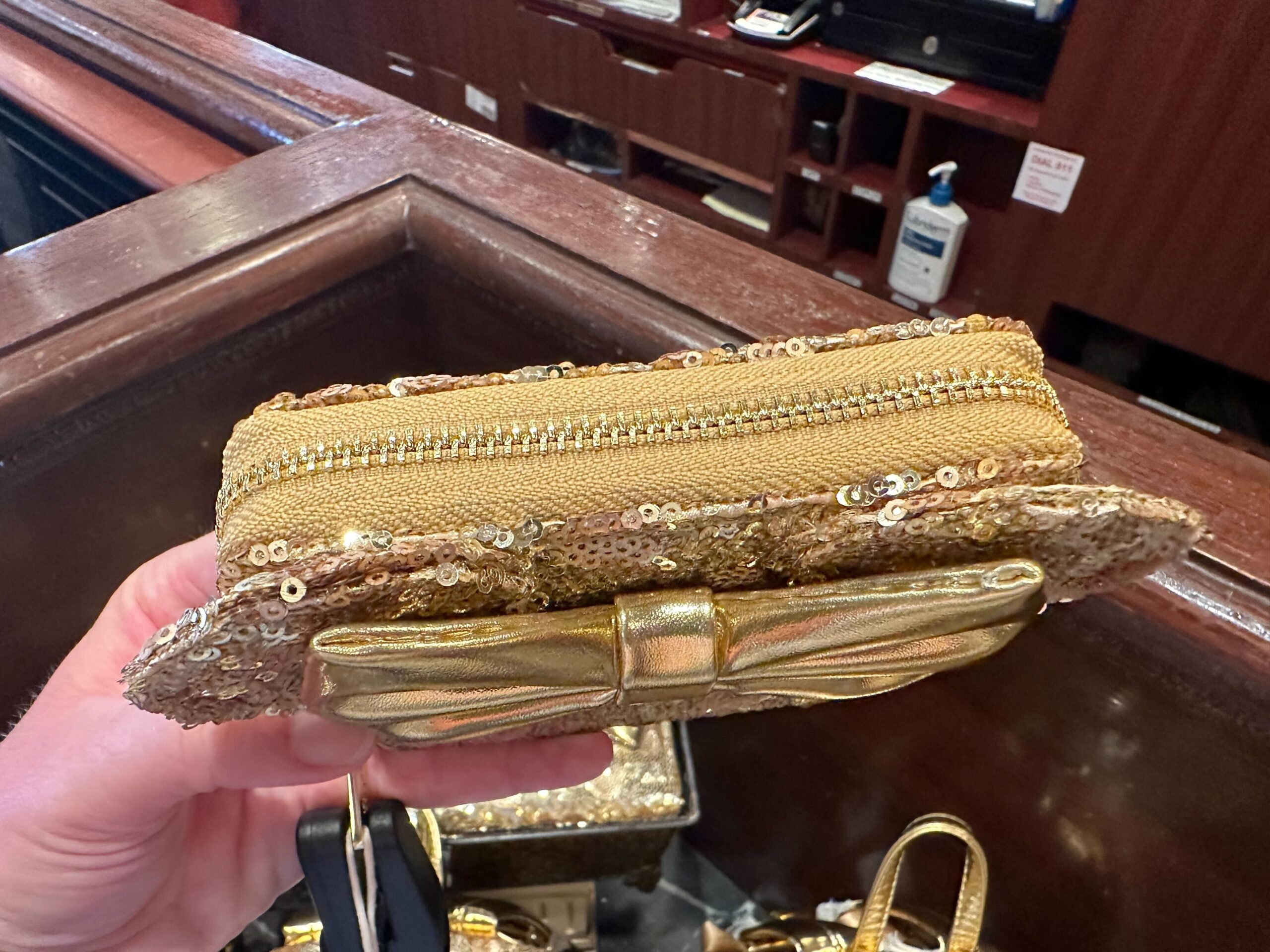 A hand holding a gold, sequined clutch bag with a zipper closure and a bow on the front. A store counter and a sanitizer dispenser are visible in the background, perfect for those Disneyland trips.