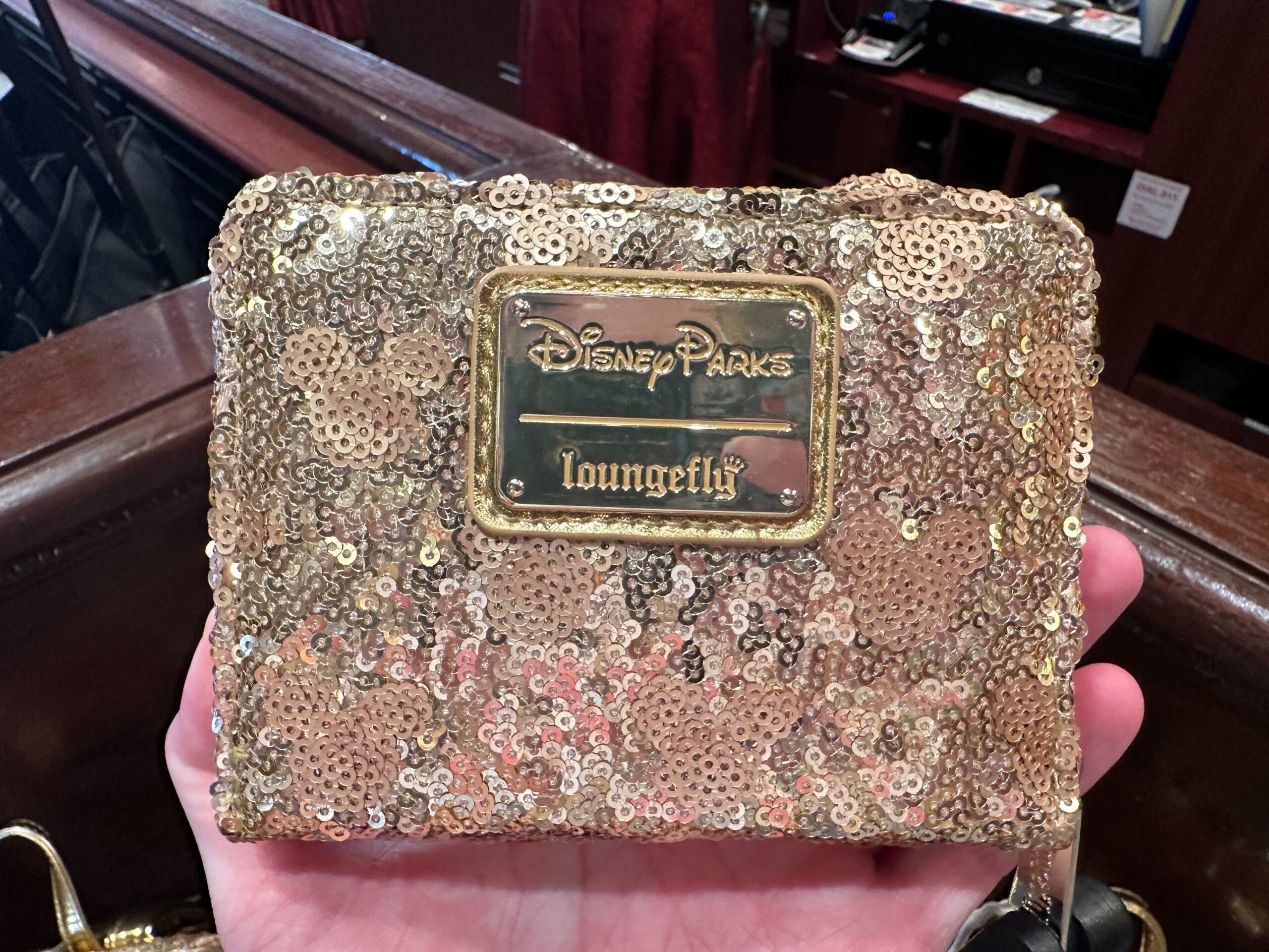 A gold sequin Loungefly wallet labeled "Disney Parks Loungefly" held in a hand against a background of a wooden surface, perfect for your next trip to Disneyland.