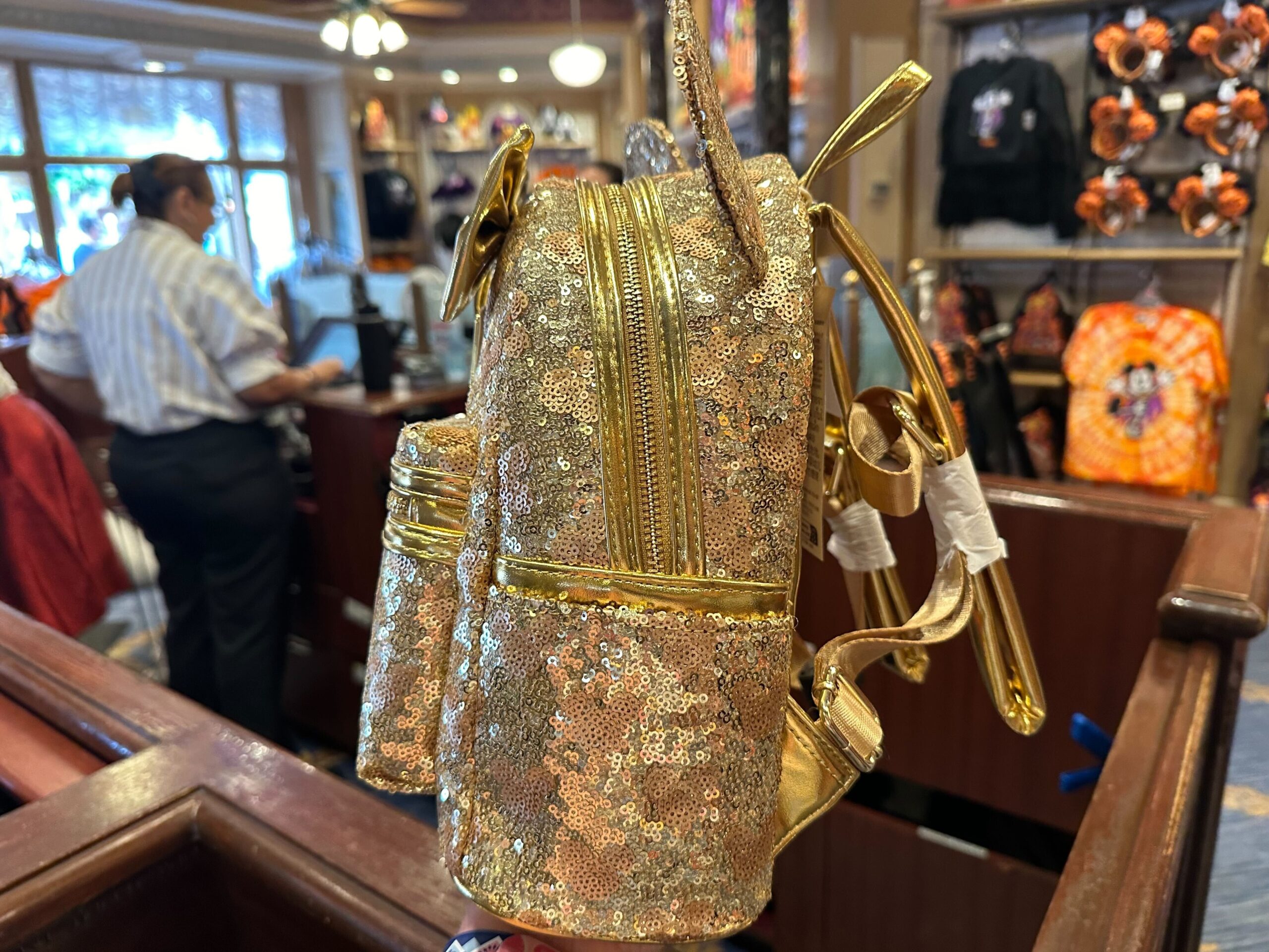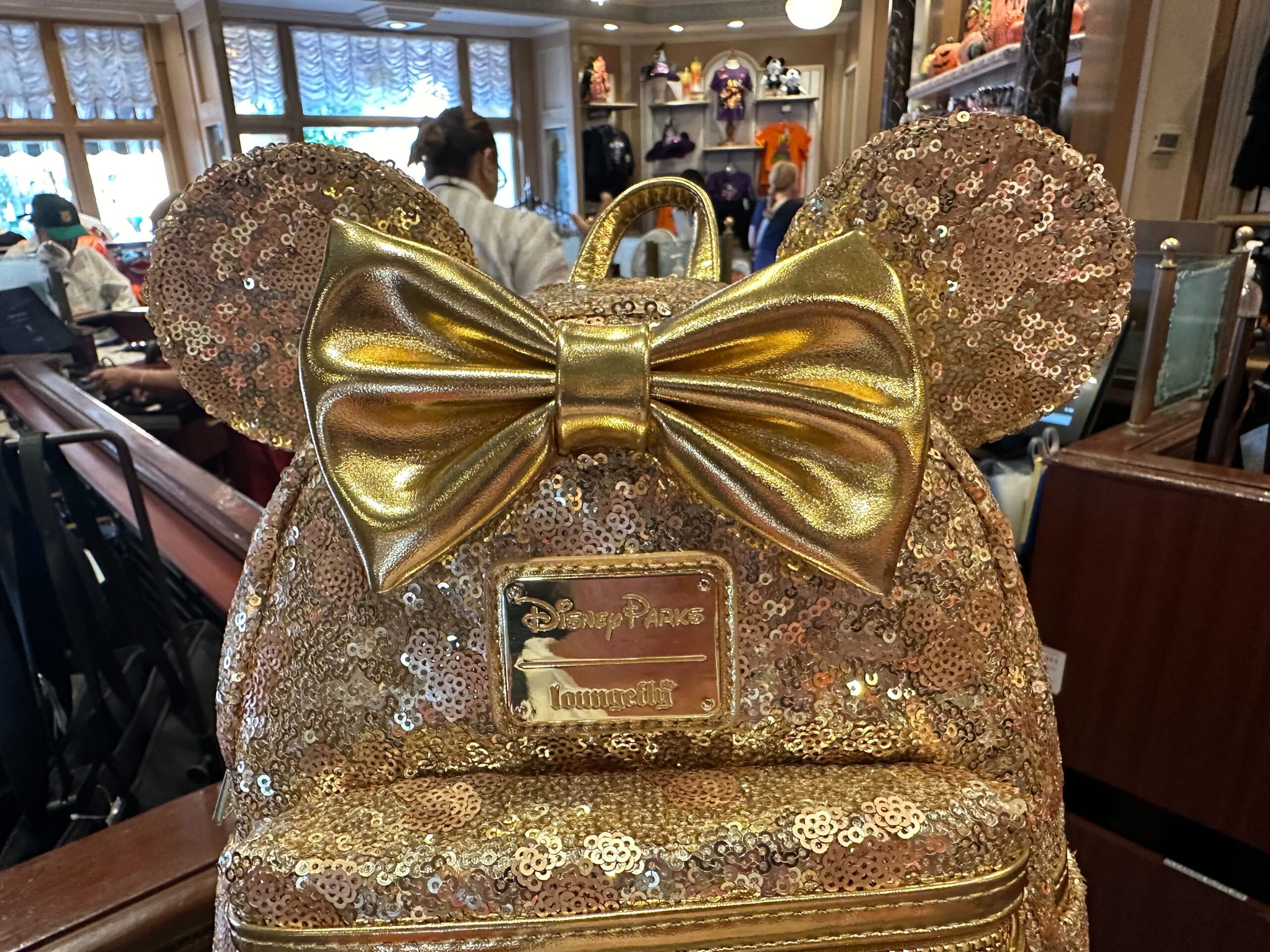 A Gold Sequin Loungefly Bag with Mickey Mouse ears and a large gold bow is displayed inside a store, perfect for any Disneyland visit.