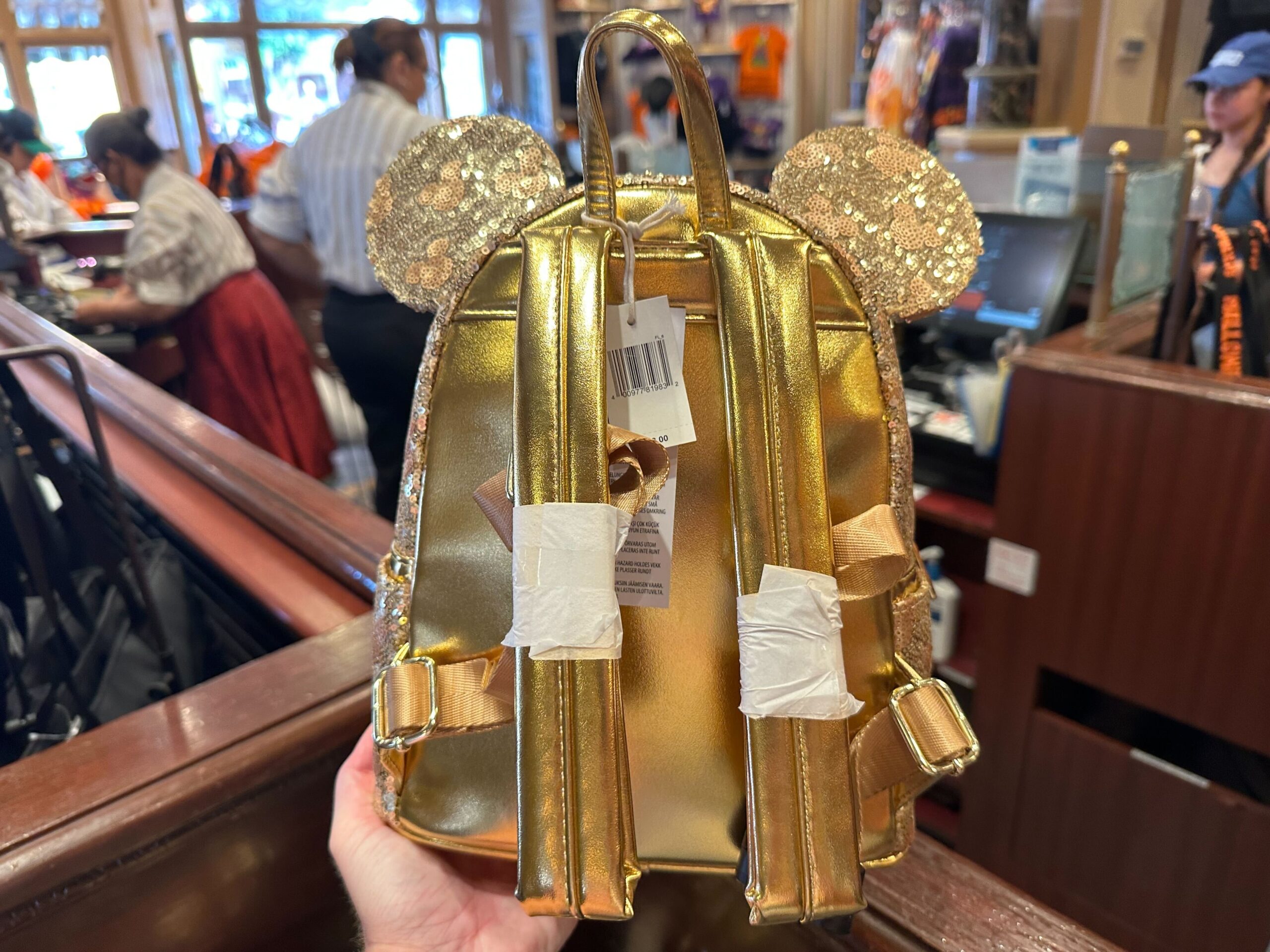 A Gold Sequin Loungefly Bag with sequin-trimmed ears is displayed in a store, held by a person's hand. The backpack, complete with two straps and a barcode tag, stands out as people shop in the background.