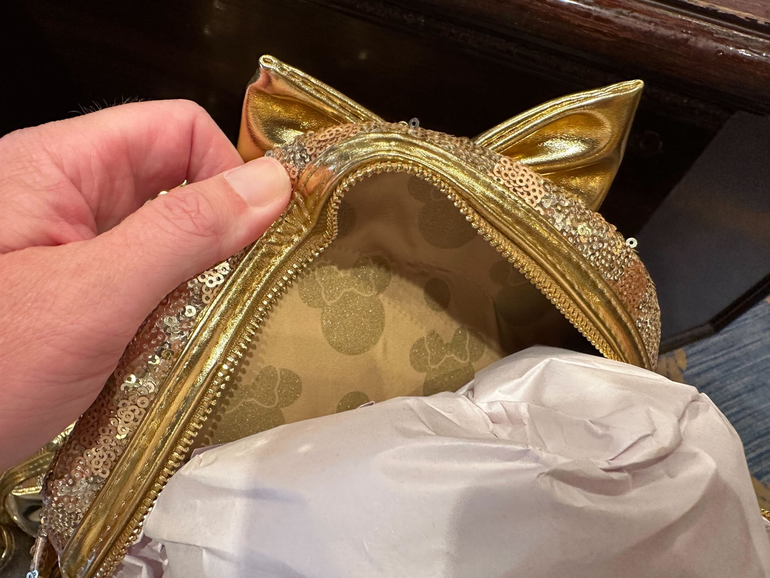A hand holding an open, golden sequined pouch with cat ear details—an exquisite Gold Sequin Loungefly bag—reveals a beige patterned interior and a crumpled white paper inside.