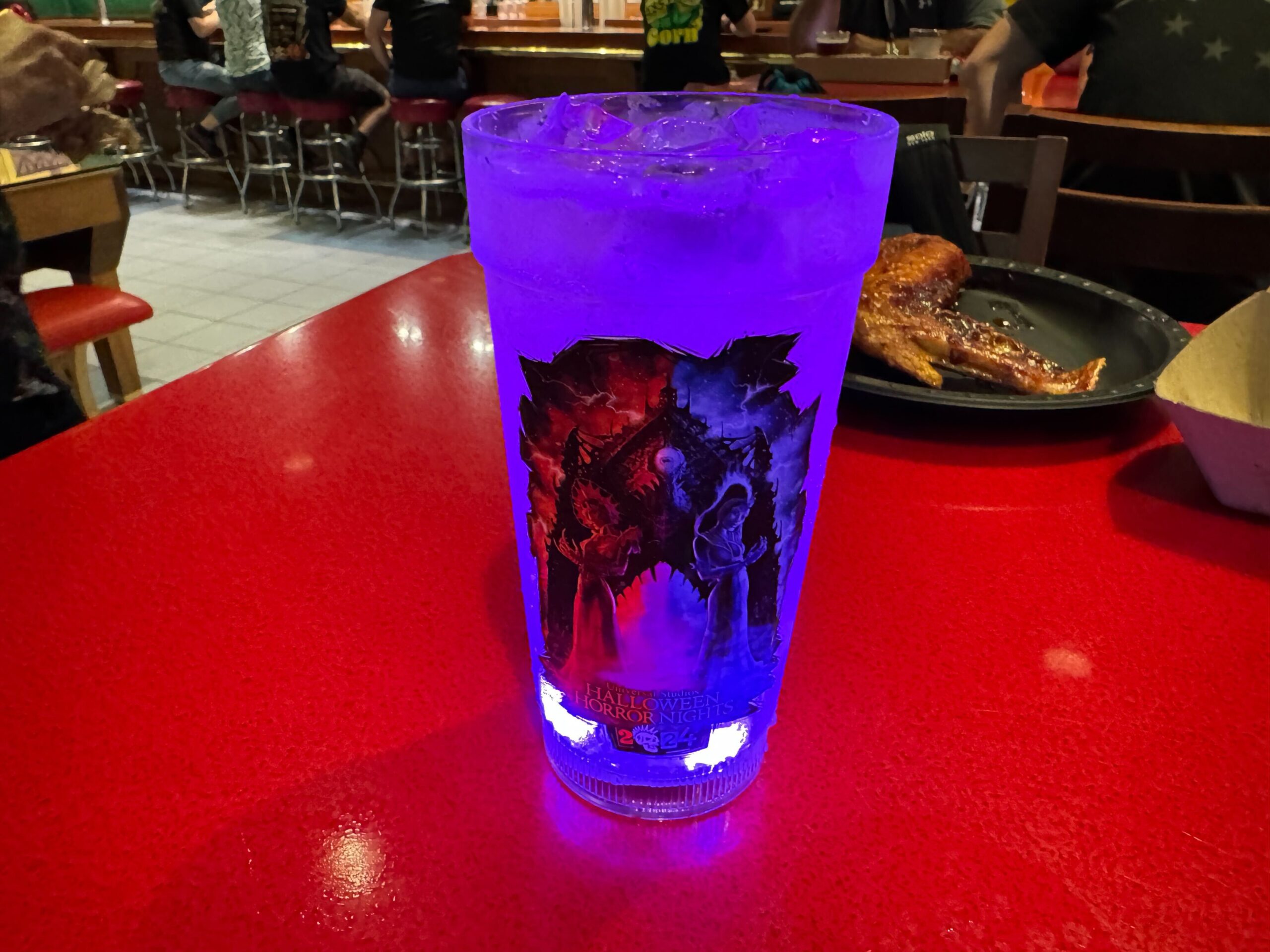 A clear plastic cup filled with a purple liquid and ice sits on a glossy red table, perfect for those wild nights at Halloween Horror Nights 33. An illuminated drink container with graphics is partially visible on the right side, inviting guests to eat and drink amidst the spooky festivities.