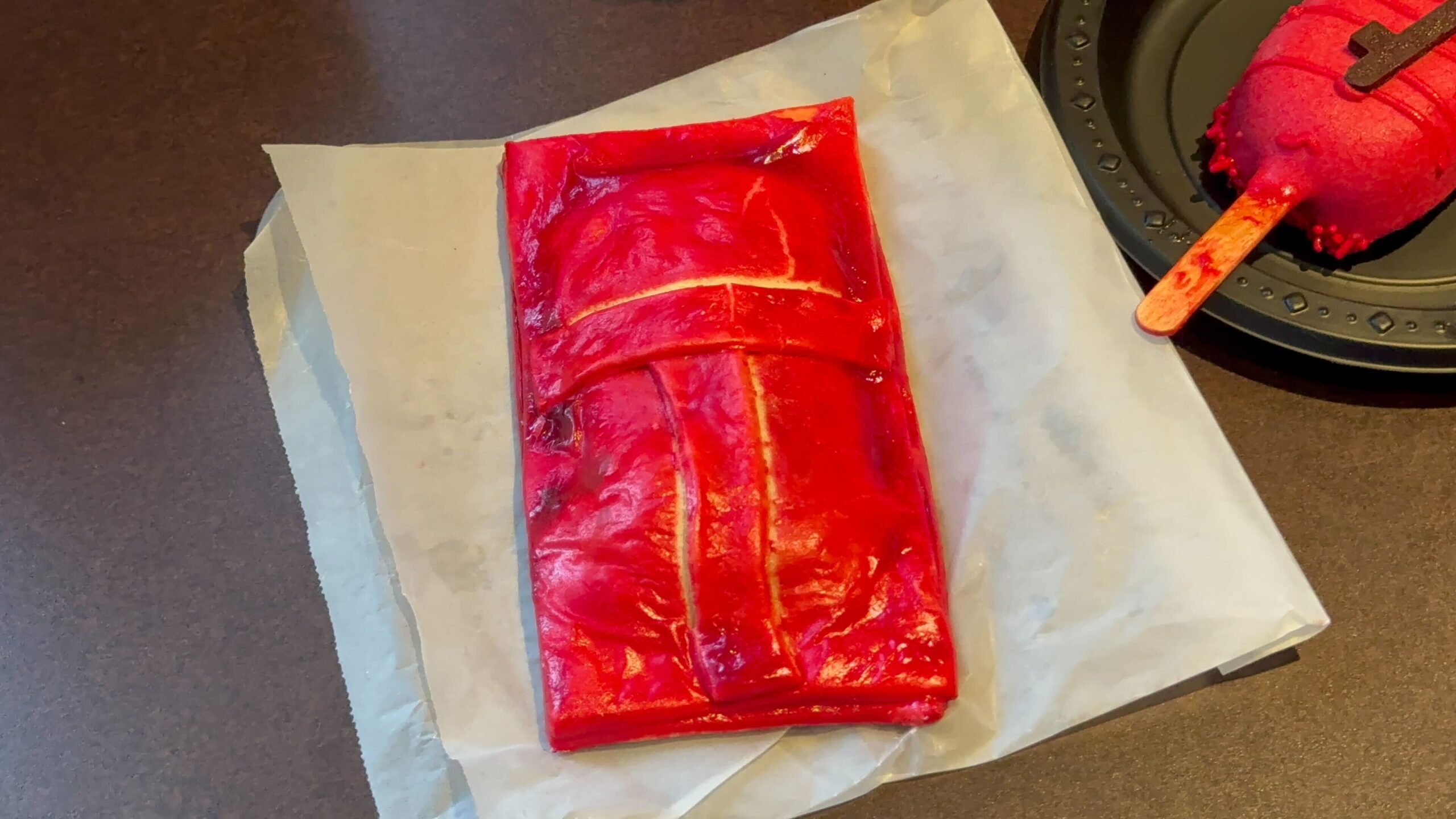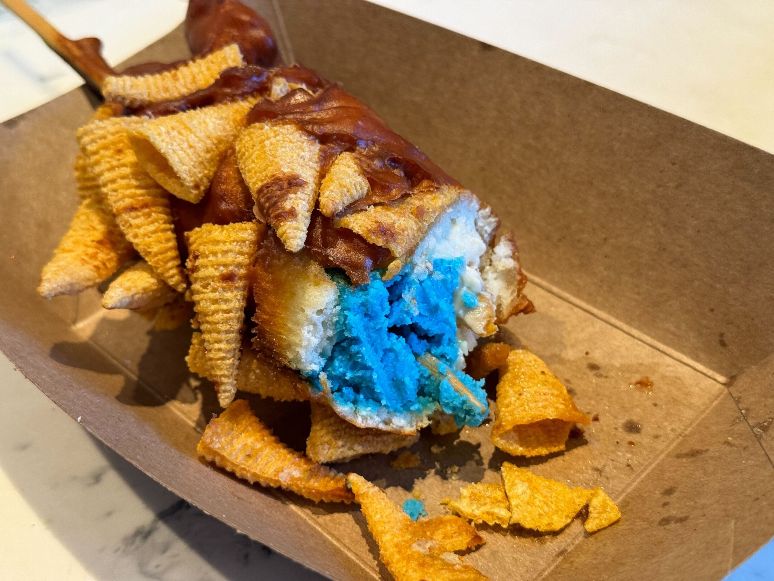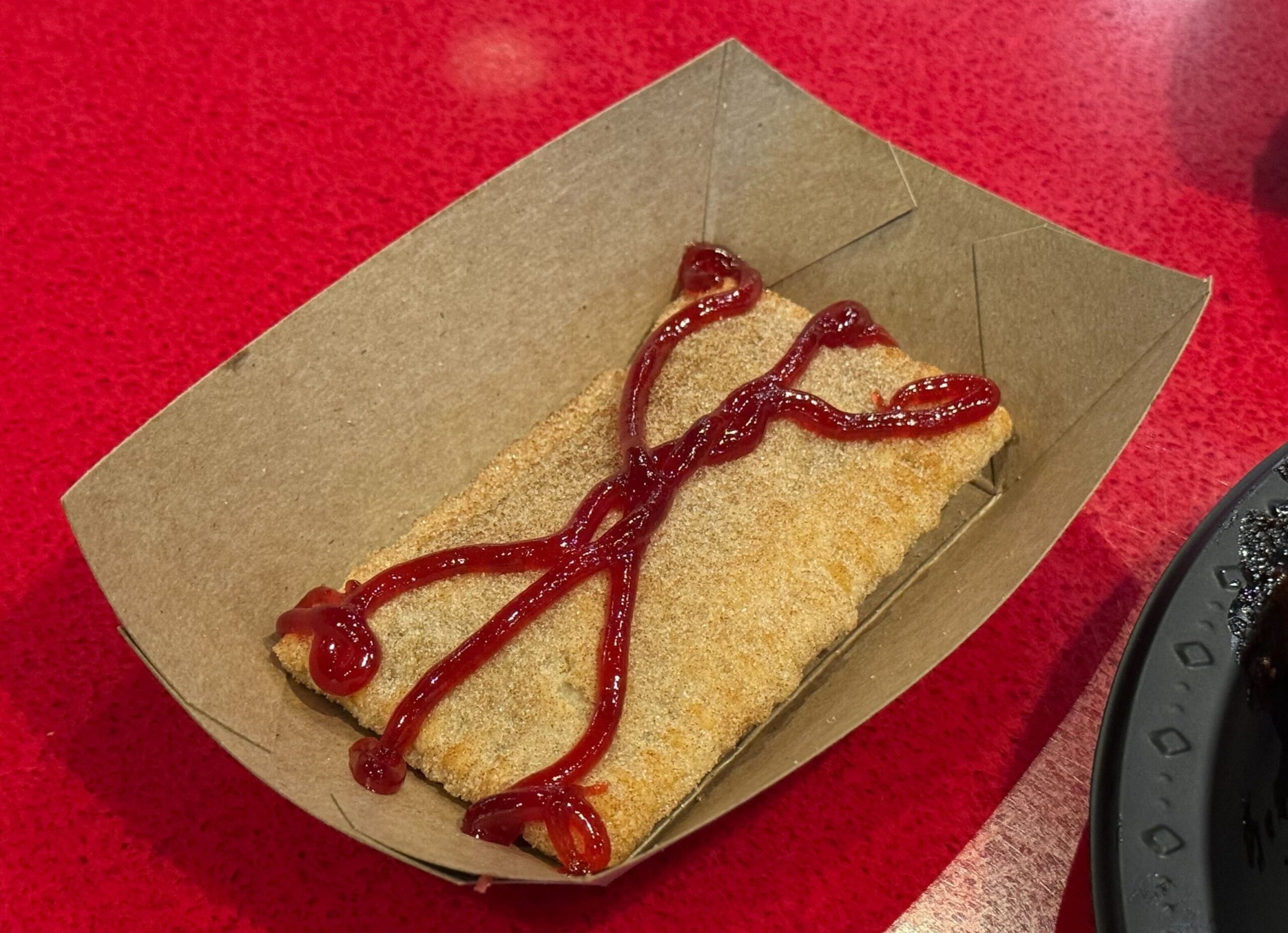 A fried pastry in a cardboard tray with red sauce drizzled on top in zigzag patterns, perfect for indulging during Halloween Horror Nights.