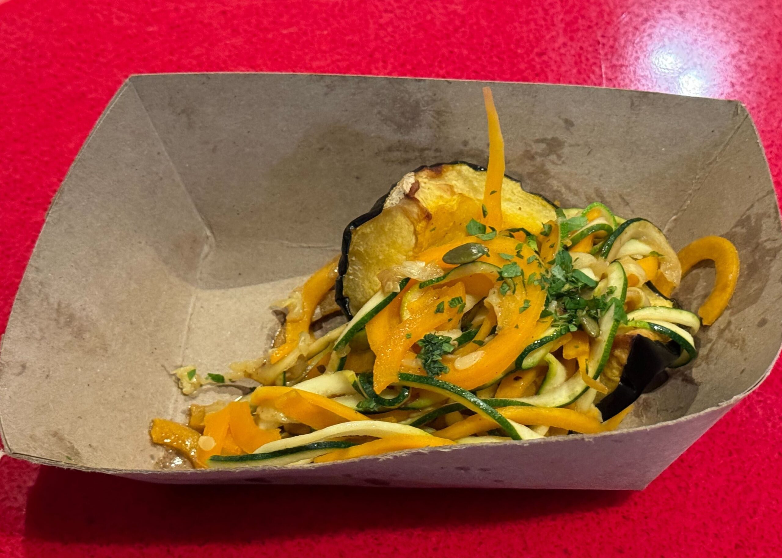 A cardboard container holds a serving of mixed vegetables, including spiralized zucchini and yellow bell pepper, garnished with chopped herbs. Perfect for savoring during Halloween Horror Nights, this fresh medley adds a healthy touch to your spooky festivities.