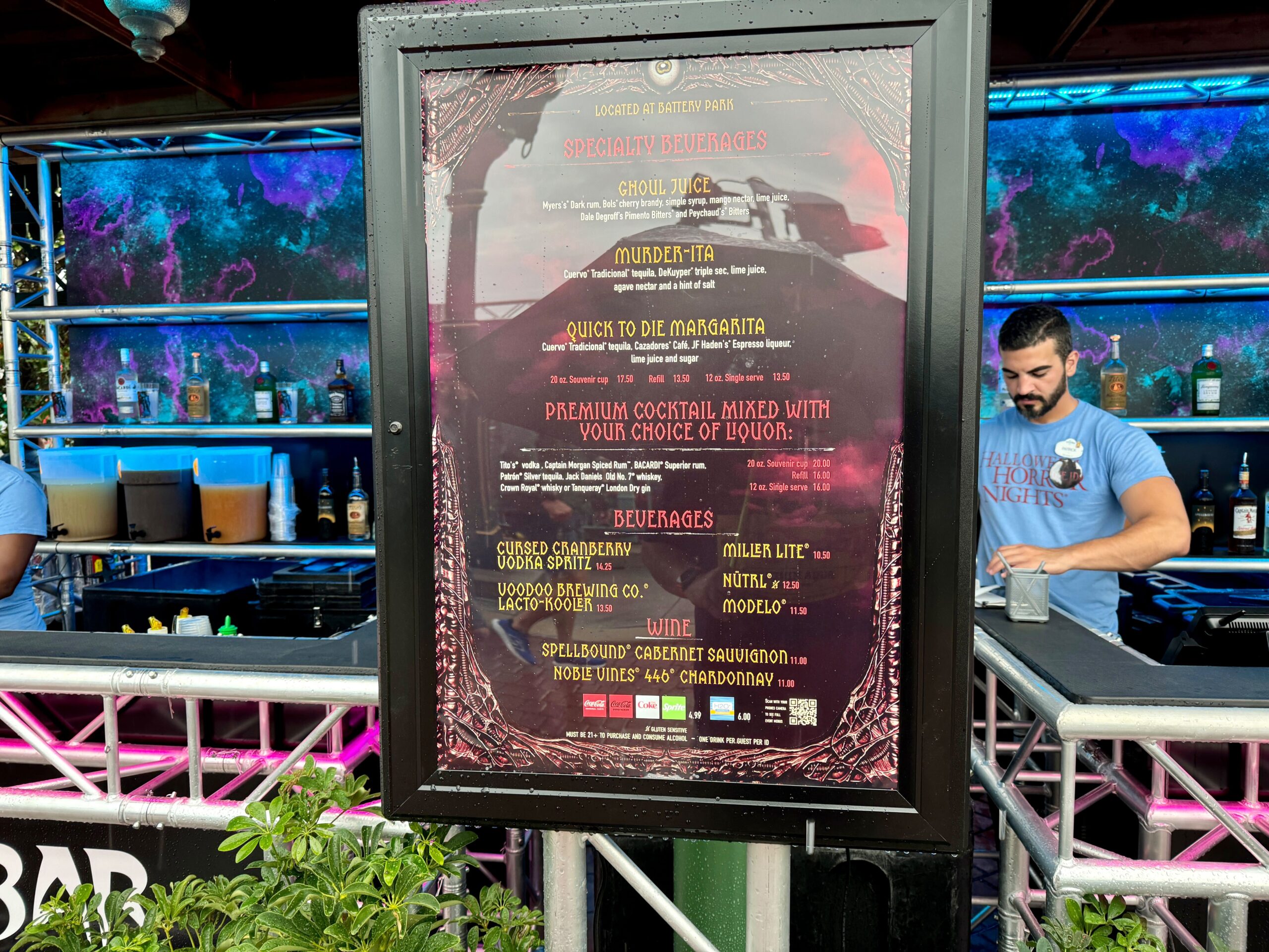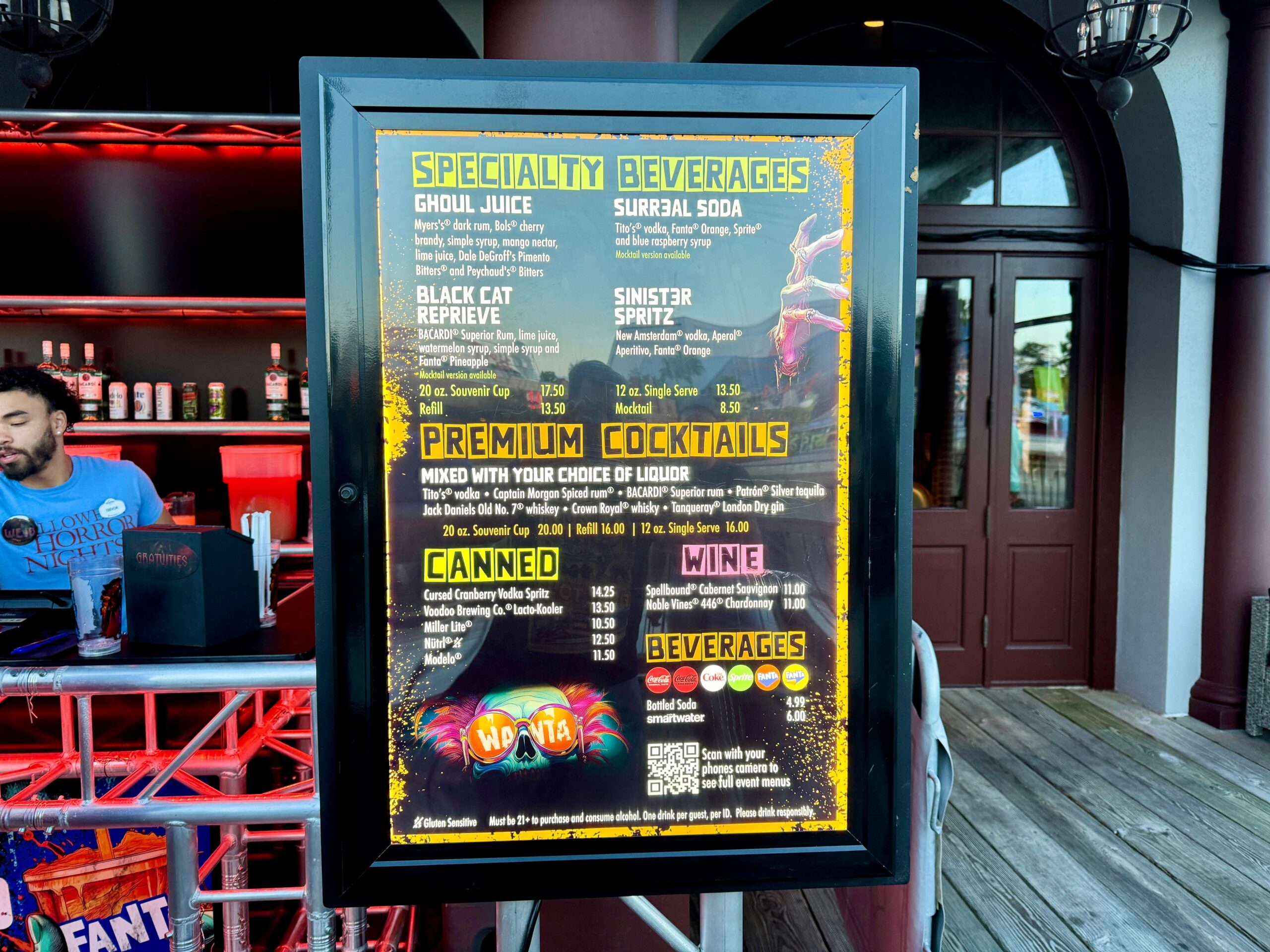 Image of a bar menu listing Specialty Beverages, Premium Cocktails, Canned drinks, Wine, and other Beverages. The menu is colorful with a mix of drink names and prices. A bartender is visible on the left. Perfect for holiday reviews or those planning their next visit to Halloween Horror Nights!
