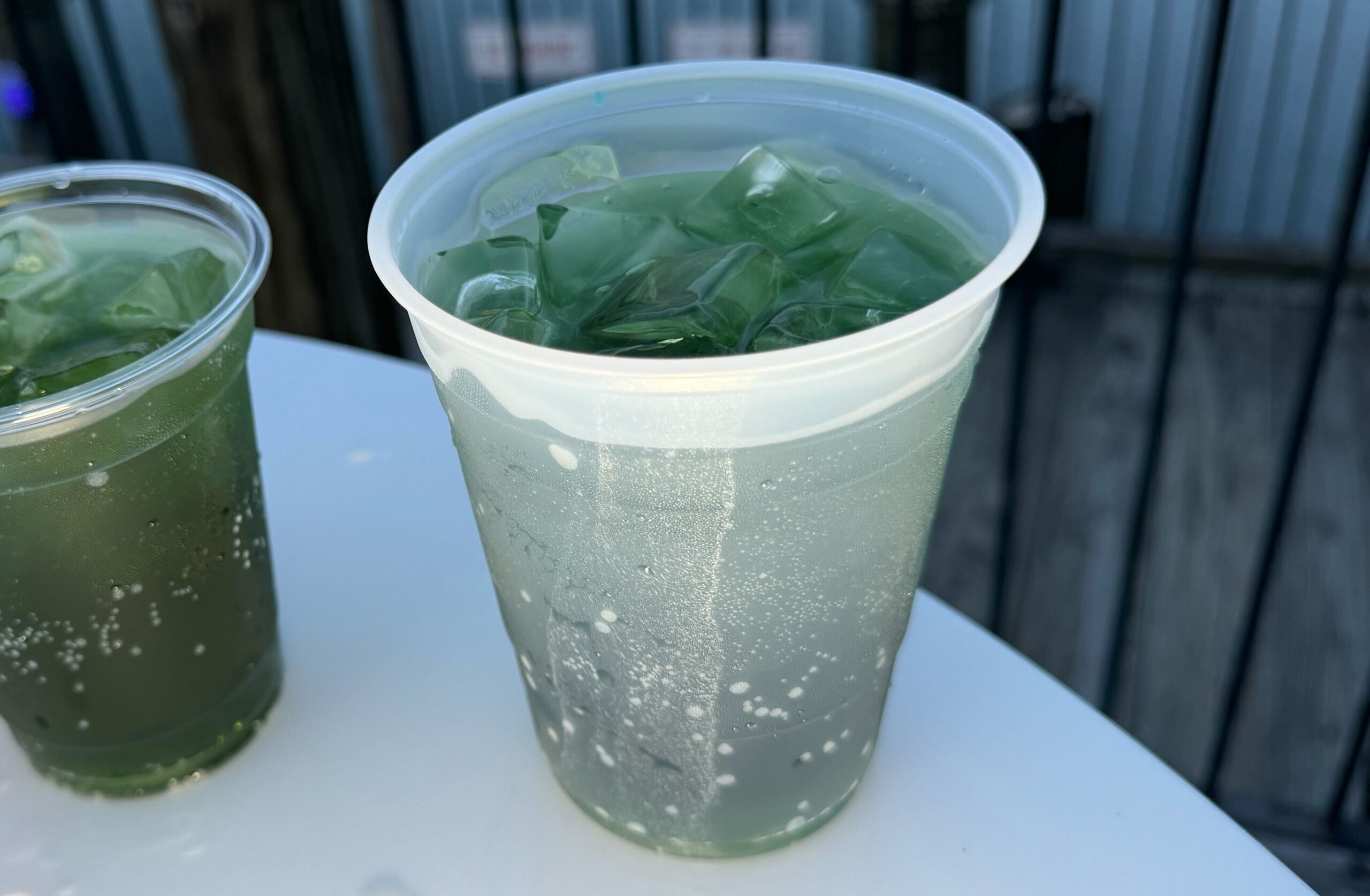 A plastic cup filled with a green iced beverage sits on a white table, next to another similar cup partially visible, ready for your refreshing pause while exploring Halloween Horror Nights.