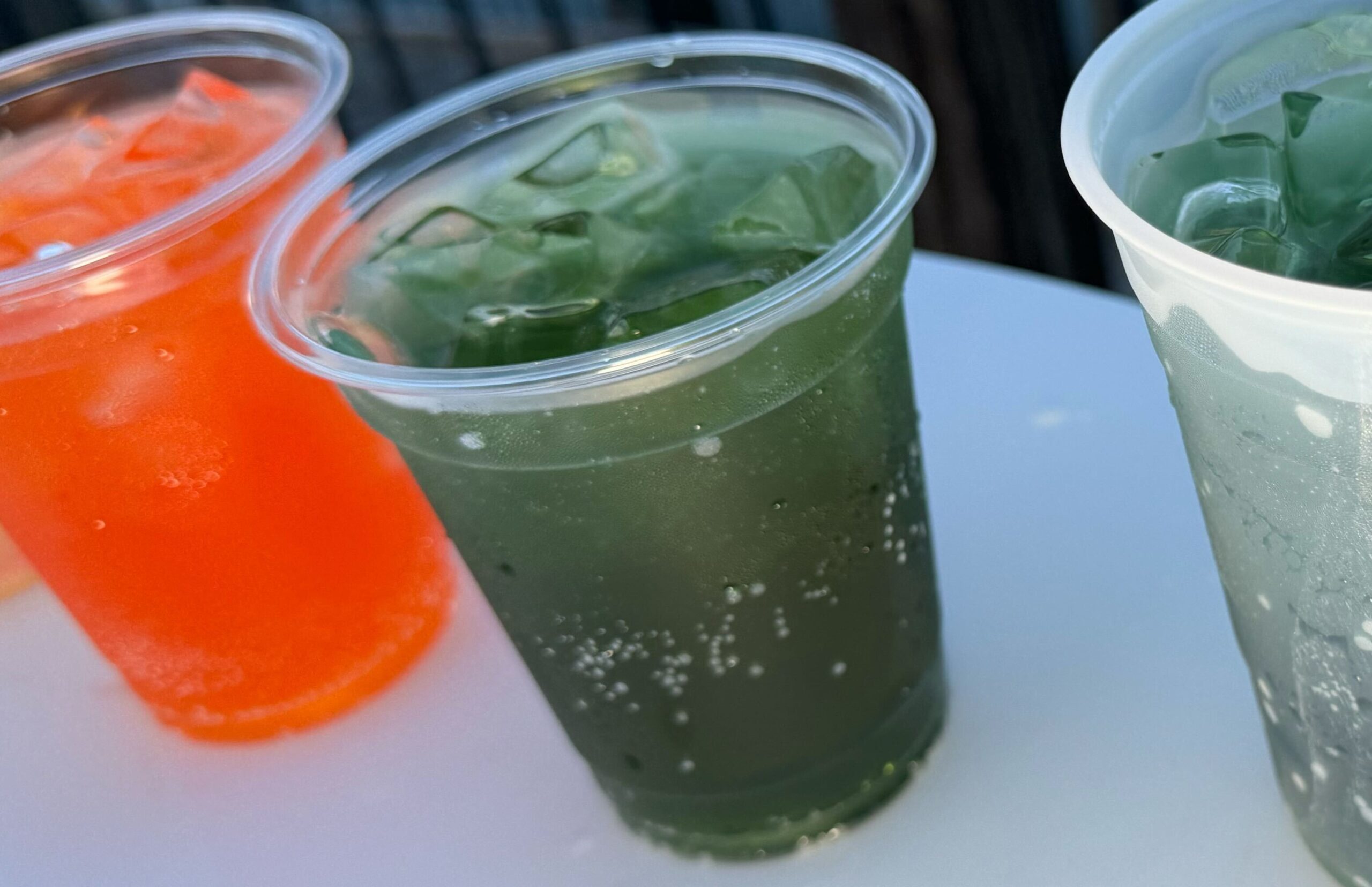 Three plastic cups filled with different colored beverages and ice cubes are placed on a white surface. Perfect for Halloween Horror Nights, the drinks are orange, green, and clear with a green tint.