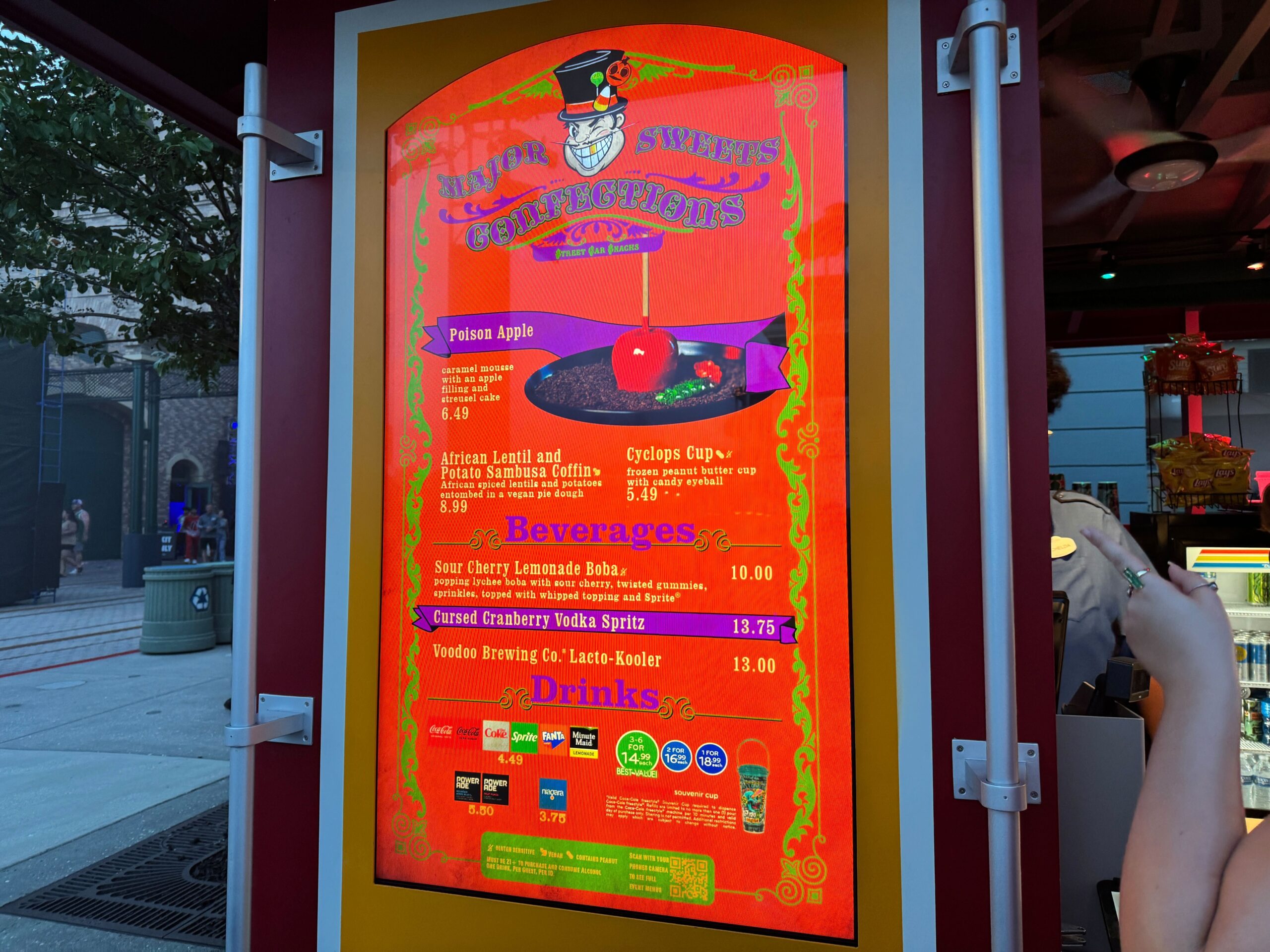 A bright orange menu board features various colorful beverage and snack options, including themed items like "Poison Apple" and "Cyclops Cakes," perfect for Halloween Horror Nights. A hand is visible, interacting with the sensory feast where you can eat and drink ghoulish delights.