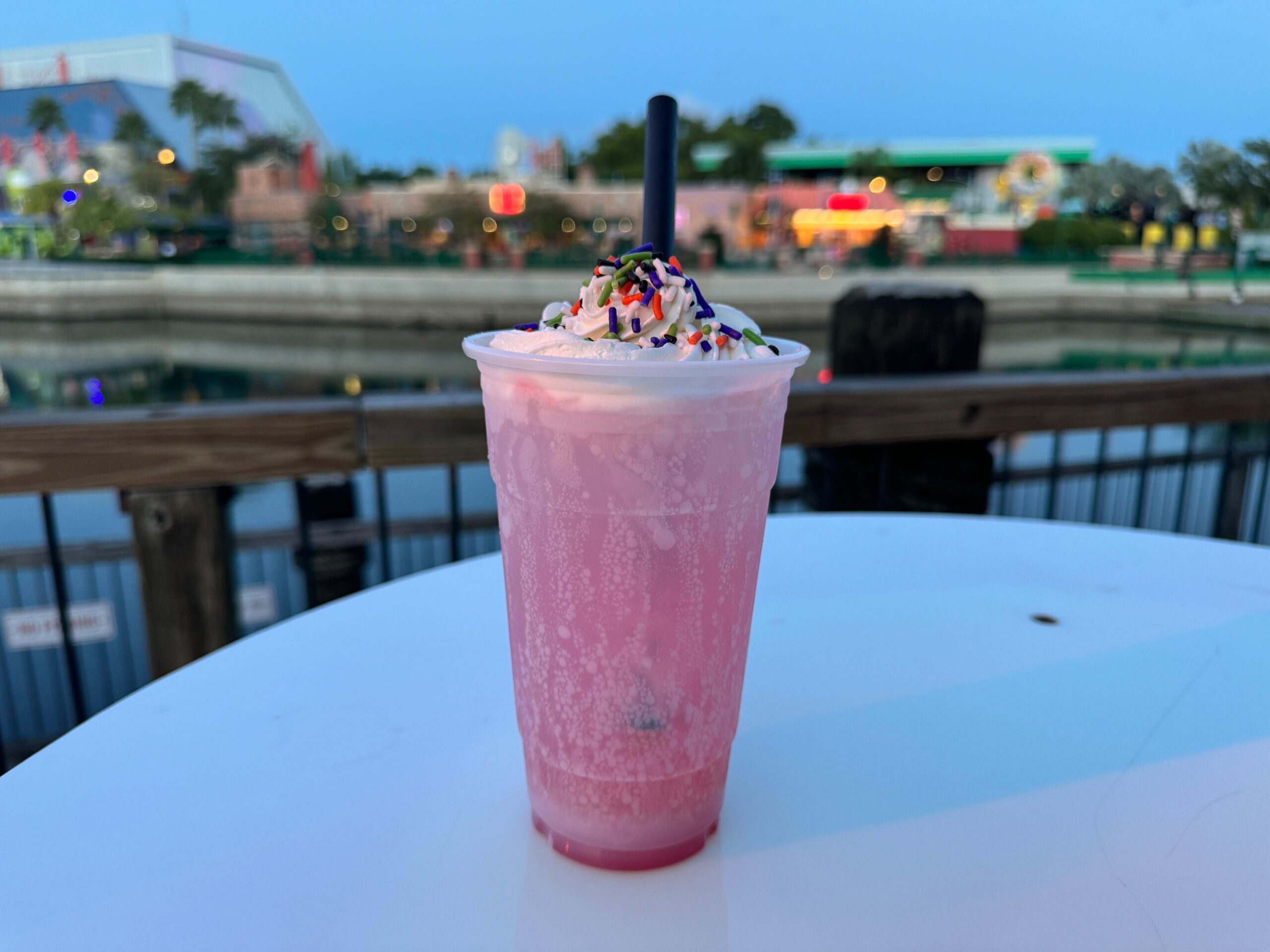 A pink iced drink topped with whipped cream and rainbow sprinkles in a clear plastic cup with a black straw, placed on a white table near an outdoor area with a pool and buildings in the background, perfect for refreshing breaks between Halloween Horror Nights adventures.