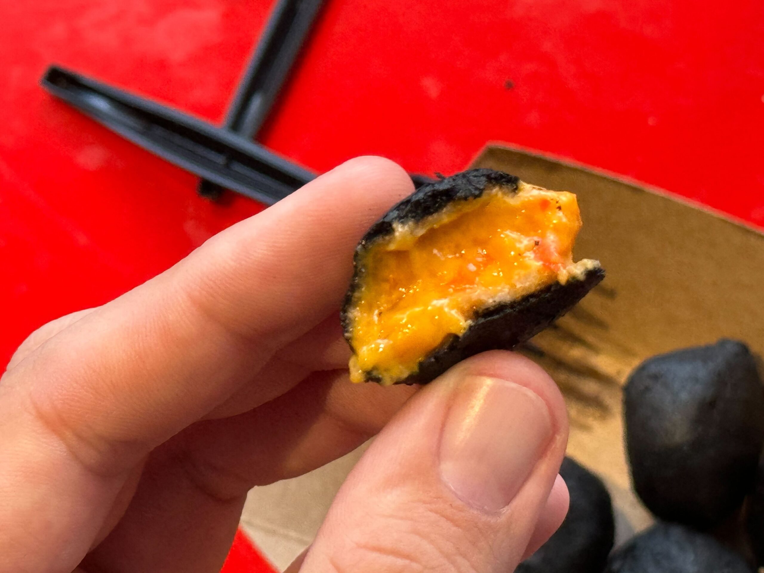 This is an updated version of the Pumpkin Guts dish from HHN 30’s Wicked Growth food booth. This isn’t bad, but it’s super oily. We wouldn’t have it again.