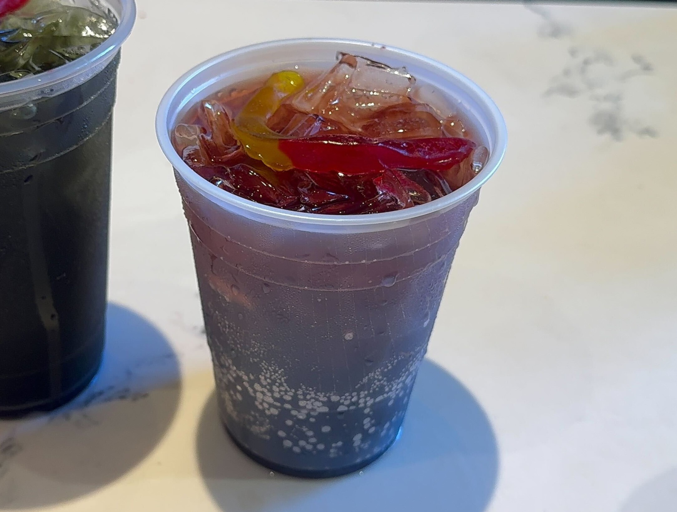 popping lychee boba with sour cherry, twisted gummies, sprinkles, topped with whipped topping and Sprite