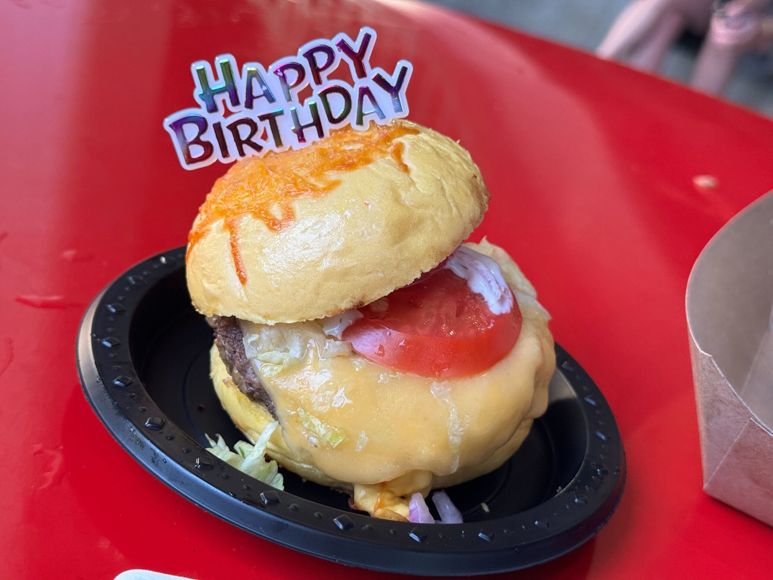 A cheeseburger with a "Happy Birthday" topper on a black plate, placed on a red table, is perfect for celebrating amidst the thrill of Halloween Horror Nights 33. Surely, it's an eat & drink experience worth capturing in anyone's reviews!