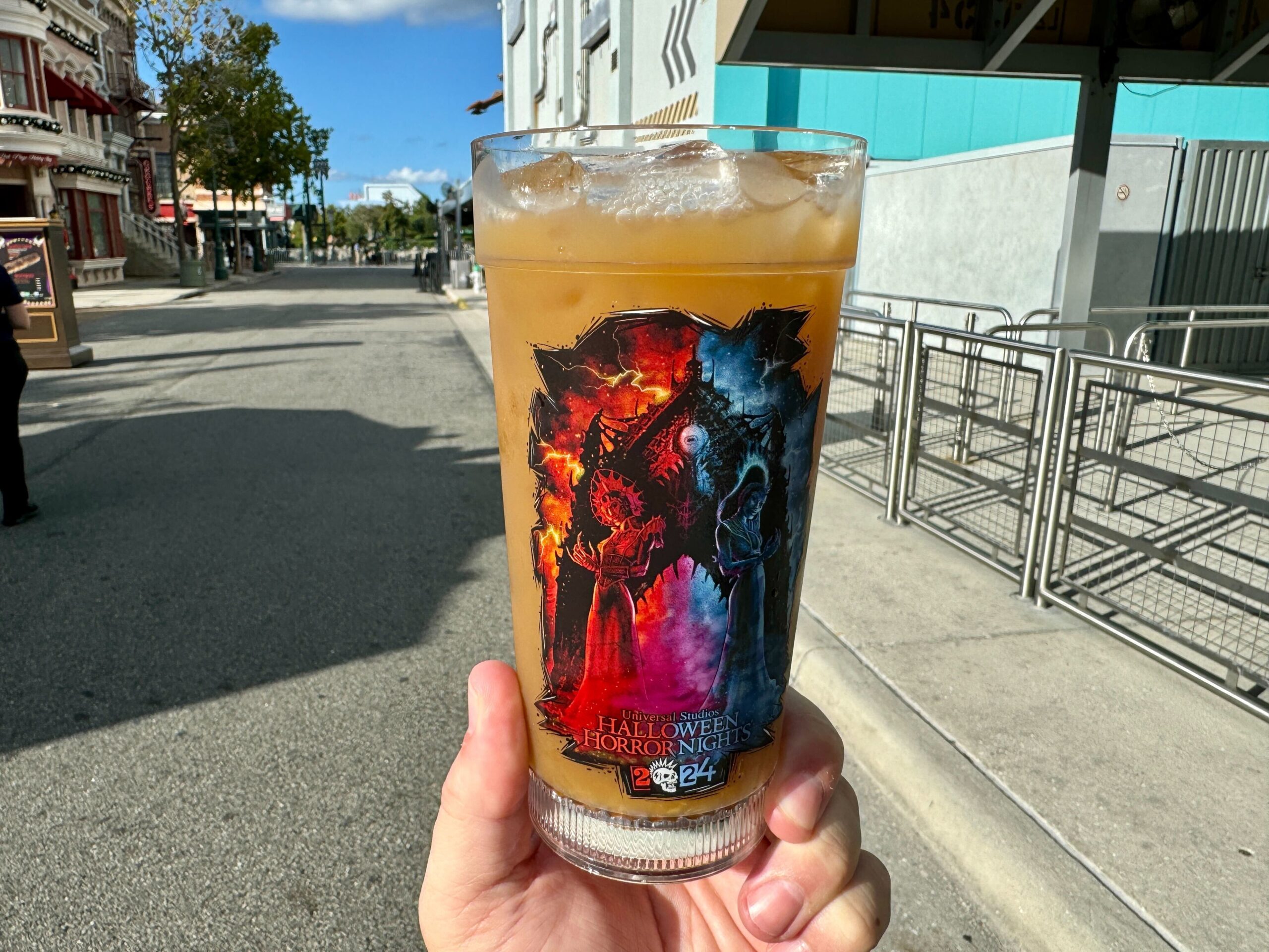 Two plastic cups filled with yellow-orange beverages, topped with ice, placed on a white surface outdoors at Halloween Horror Nights.