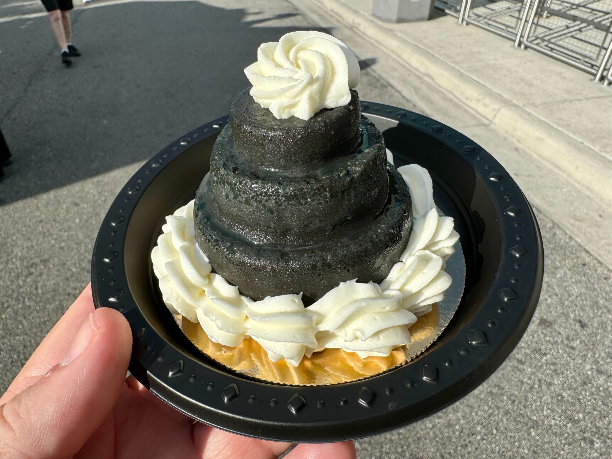 Three desserts are on a white tray: a pink balloon-shaped mochi, a small cake with frosting and sprinkles, and a black ice cream scoop with a waffle cone. Perfect for an "Eat & Drink" session while reading reviews or planning your visit to Halloween Horror Nights 33.