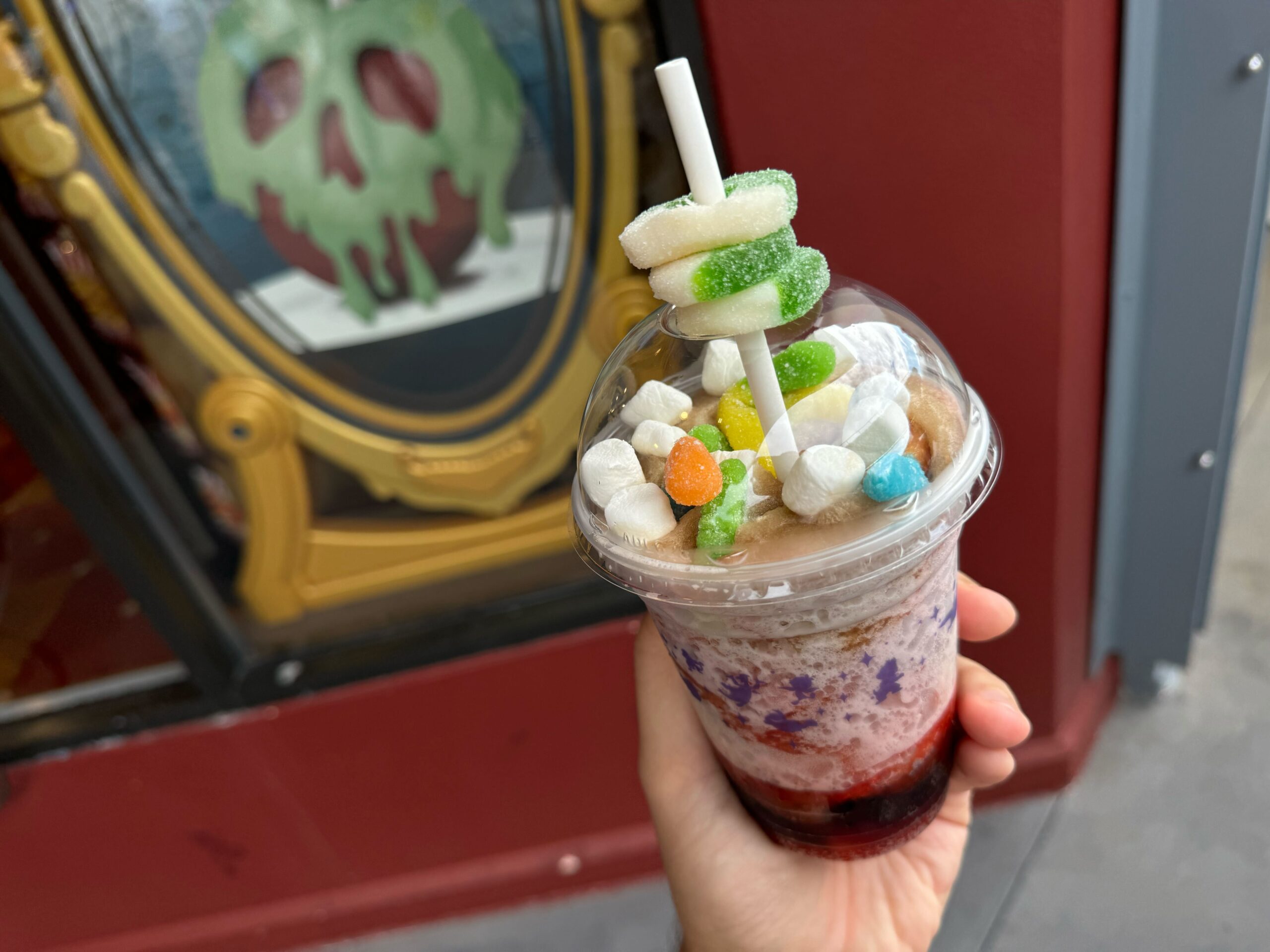 A hand holding two villain-themed snack packets, a green candy apple from the Candy Cauldron, a Halloween-themed drink with gummy candies, and a blue frozen drink at an outdoor setting.