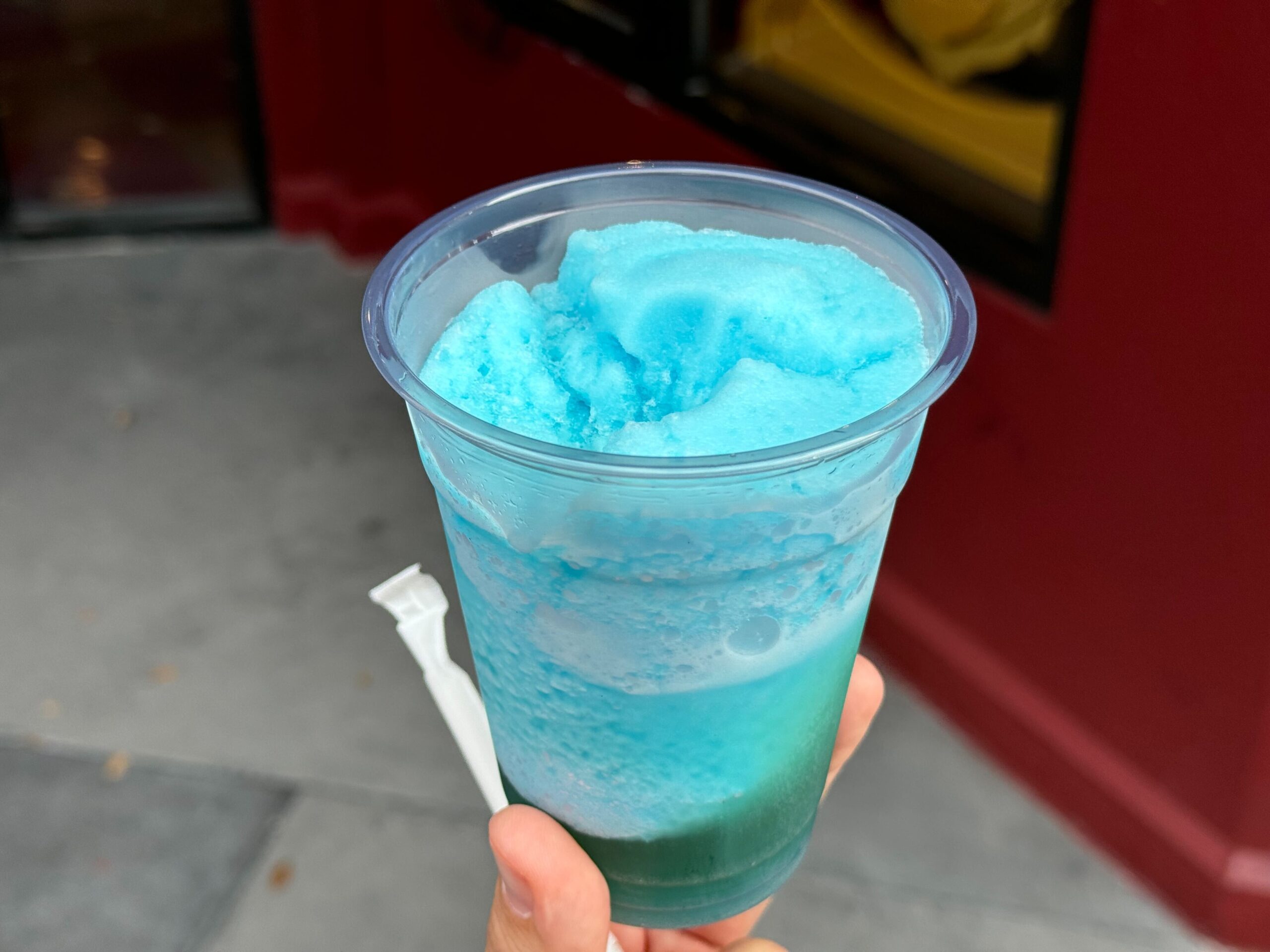 A hand holds a plastic cup filled with a blue frozen beverage in front of a red wall. A small white spoon rests on the side of the cup, one of the enticing new items at Candy Cauldron.