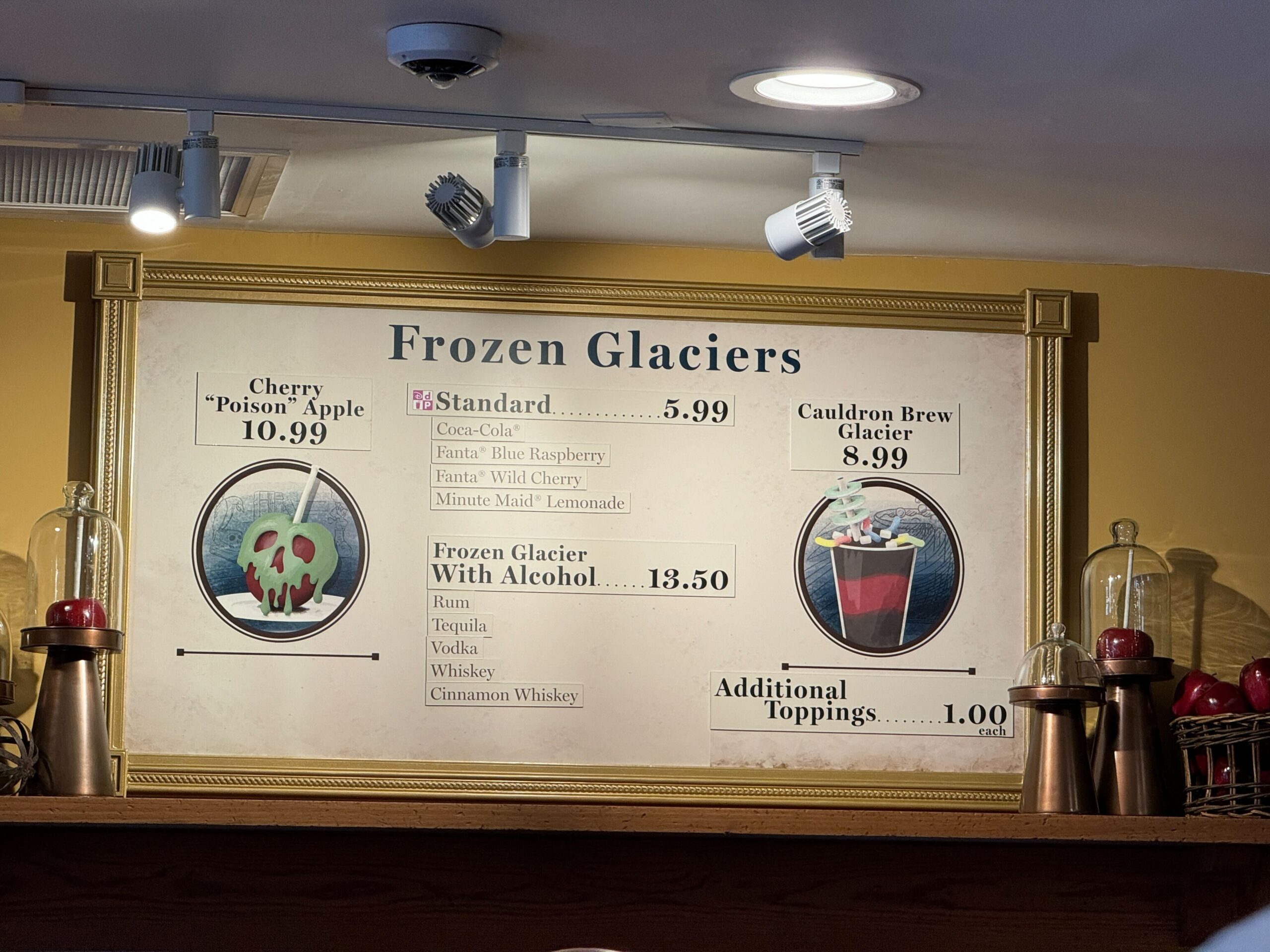 A menu titled "Frozen Glaciers" offers various beverages, featuring Cherry "Poison" Apple, Standard drinks, Cauldron Brew, and new items like the Candy Cauldron. Options with or without alcohol are available, with prices and additional toppings listed.