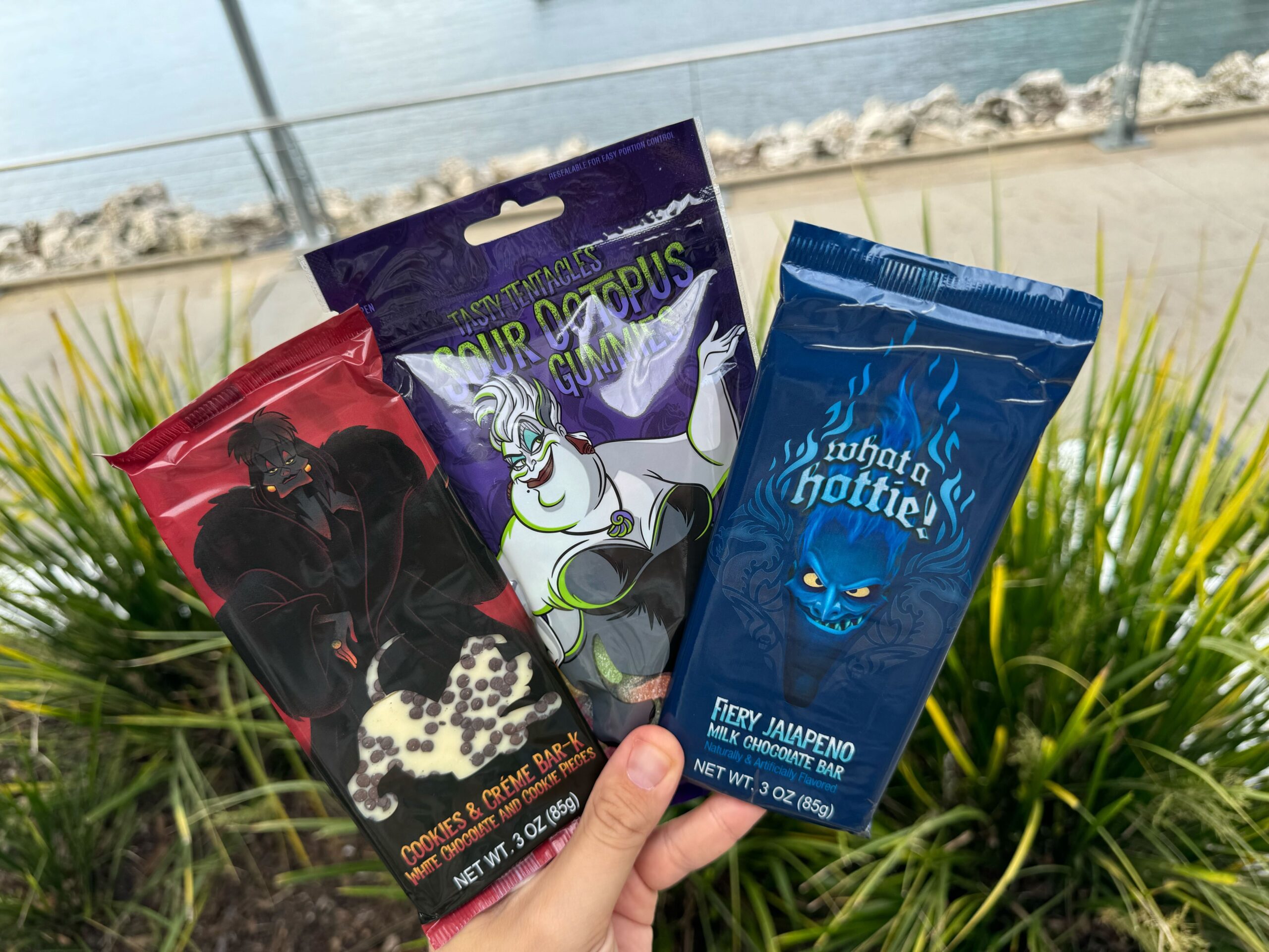 A hand holding three packets of snacks with character-themed designs and various flavors including cookies and creme, sour grape, and fiery jalapeno from Candy Cauldron. A waterfront background is visible, perfect for trying this new item.