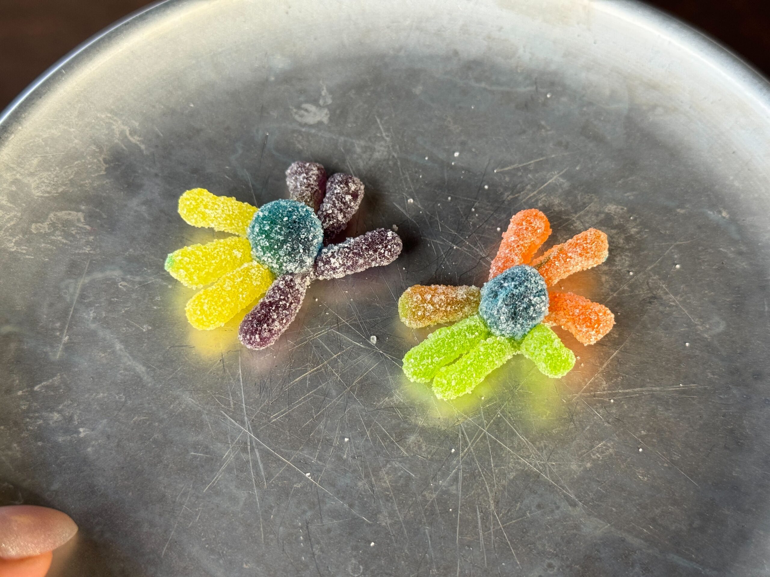 Two gummy candies shaped like flowers with a sugar coating are placed on a metallic surface. Each candy has a round center with multi-colored petals. This delightful treat is the latest new item from Candy Cauldron, perfect for adding a touch of whimsy to any sweet collection.