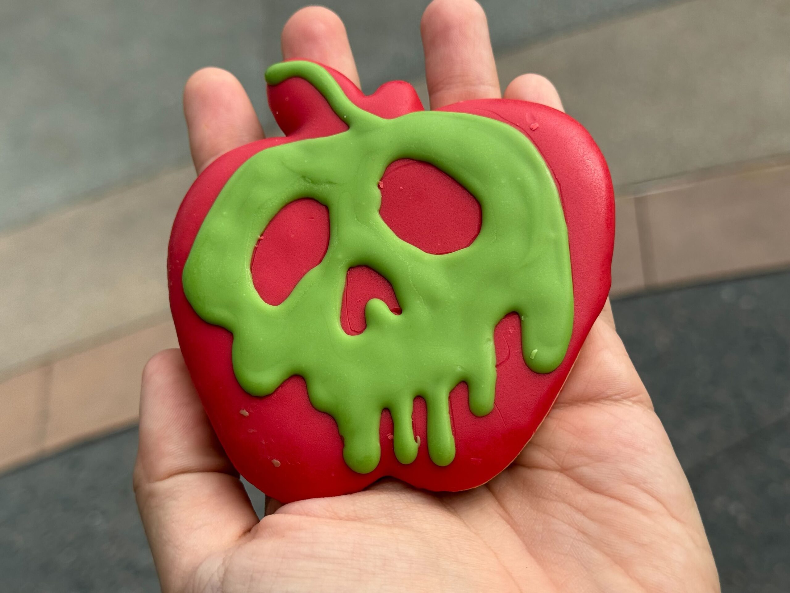 A hand holding a red apple-shaped cookie decorated with a green icing dripping pattern that resembles a skull. This new item from our Candy Cauldron collection is sure to enchant your taste buds.