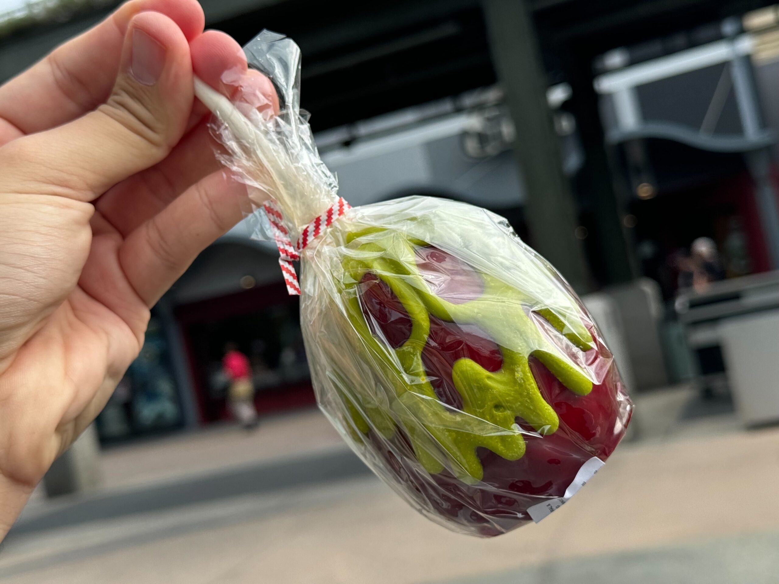 Hand holding a new item: a small candy apple from the Candy Cauldron, wrapped in clear plastic with a green melted design, tied with a red and white string. Background shows an outdoor area with a building and people walking.