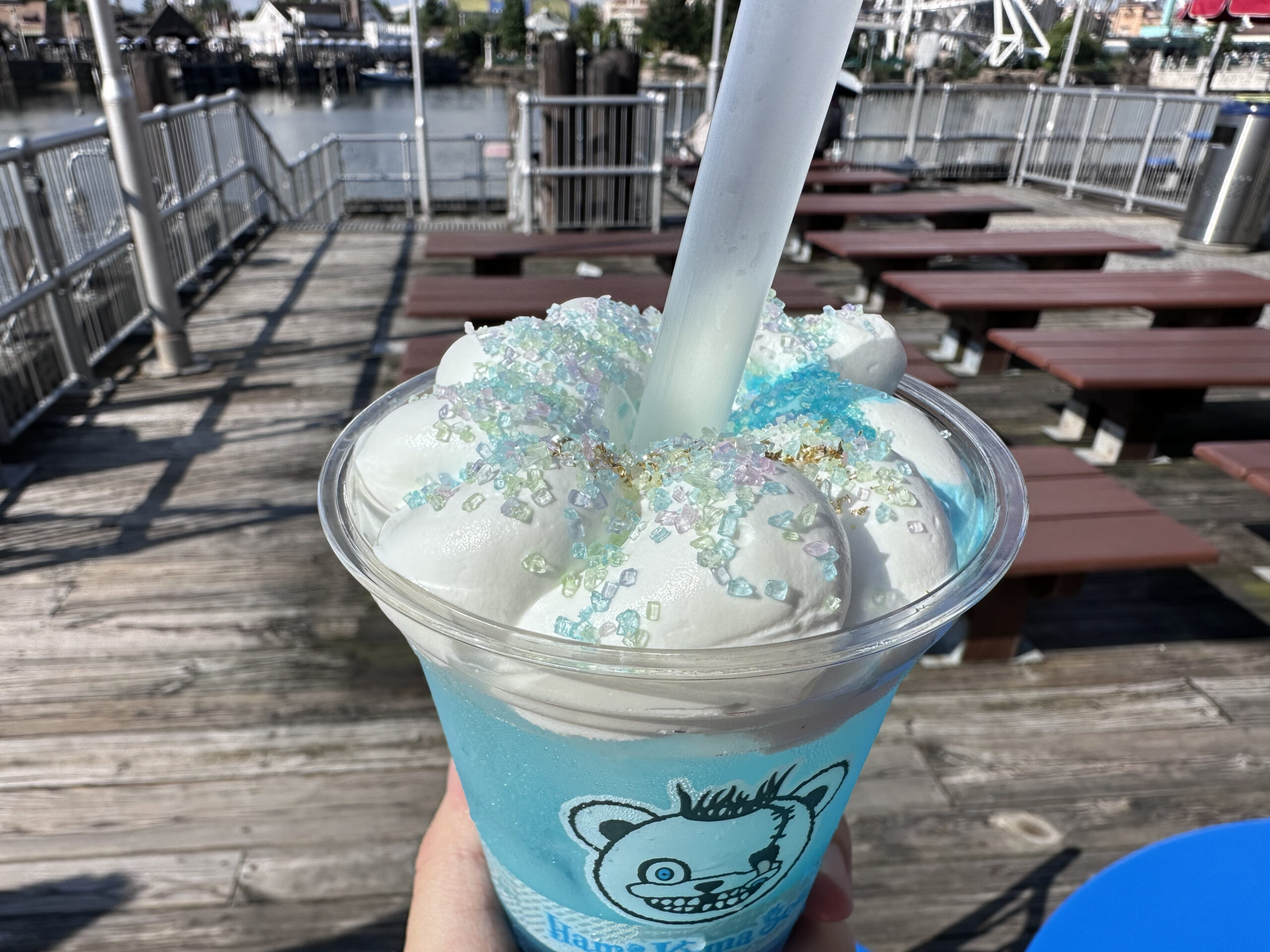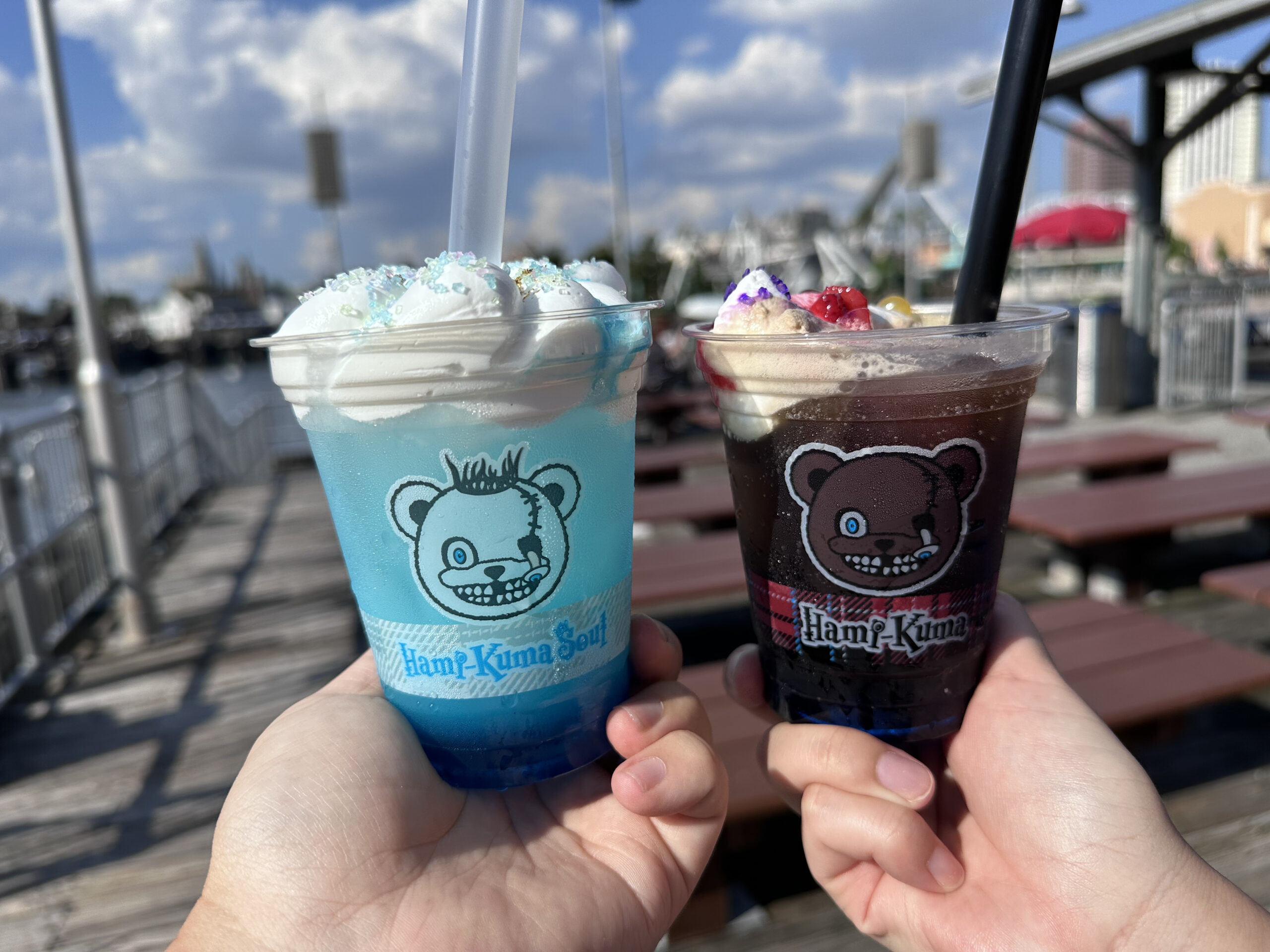 Hami-Kuma (the undead teddy bear mascot of Halloween Horror Nights) food items are at Beverly Hills Boulangerie, while drinks are at Wharf Cafe. Snoopy Halloween menu items are at Snoopy’s Backlot Cafe.