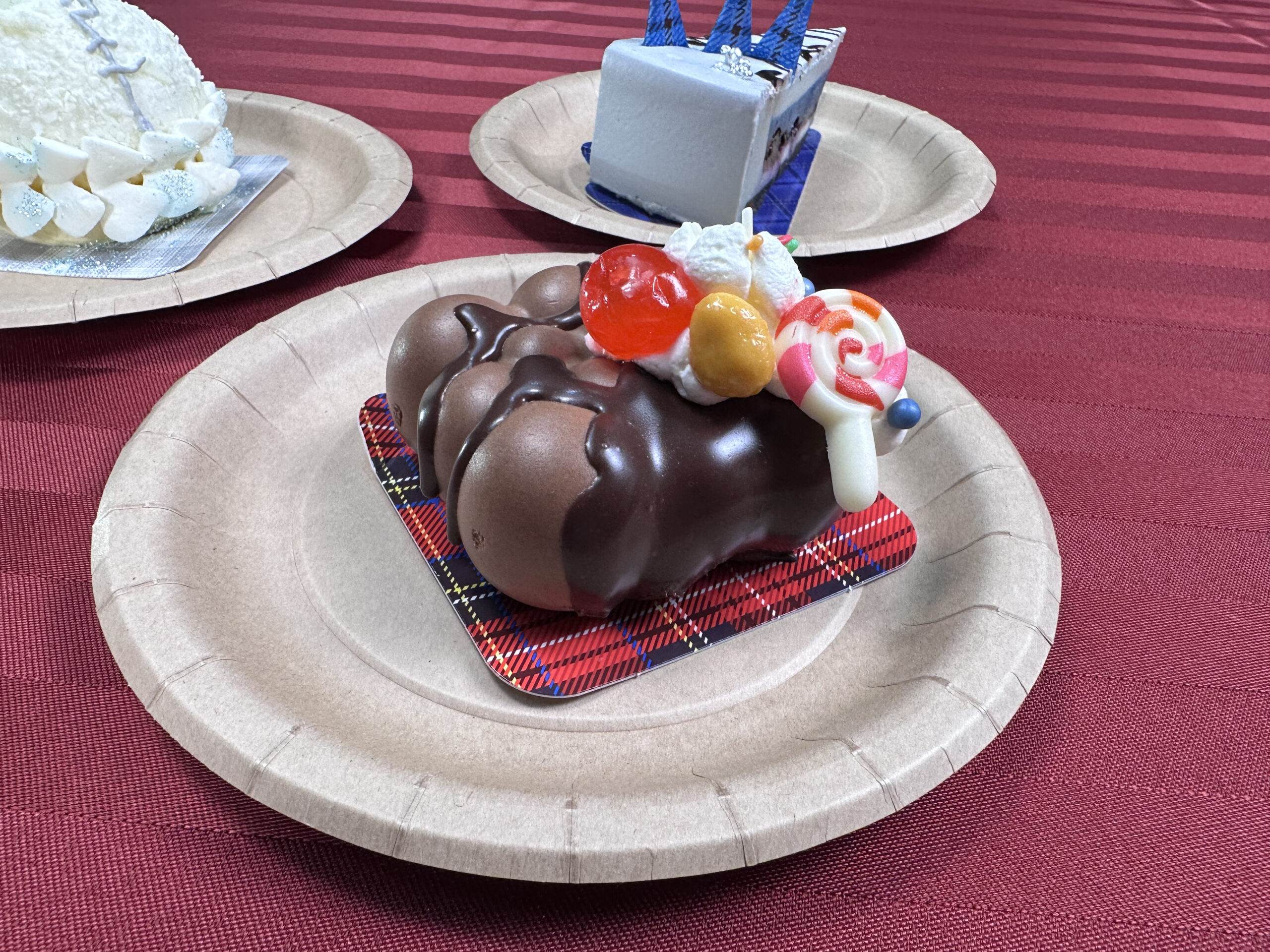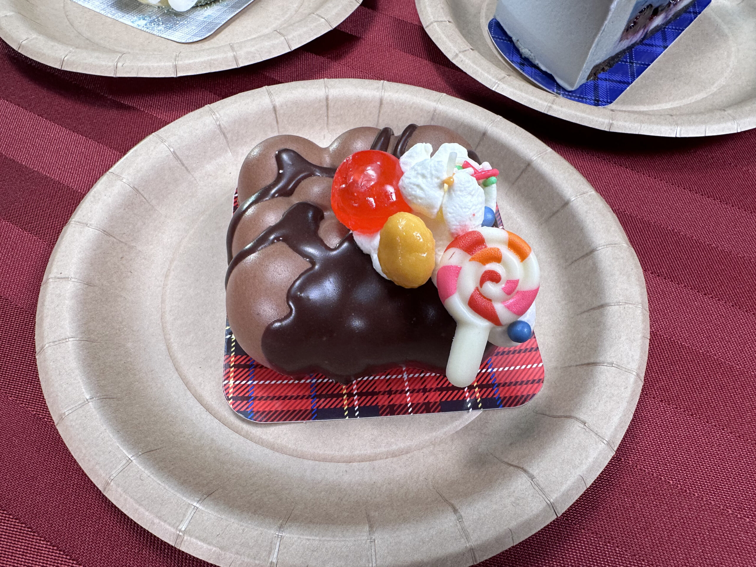 The Hami-Kuma Chocolate Cassis Cake is a visually striking dessert. This chocolate mousse is topped with cassis sauce and adorned with colorful toppings including a chocolate lollipop piece, making it look like a piece of art that’s almost too cute to eat.