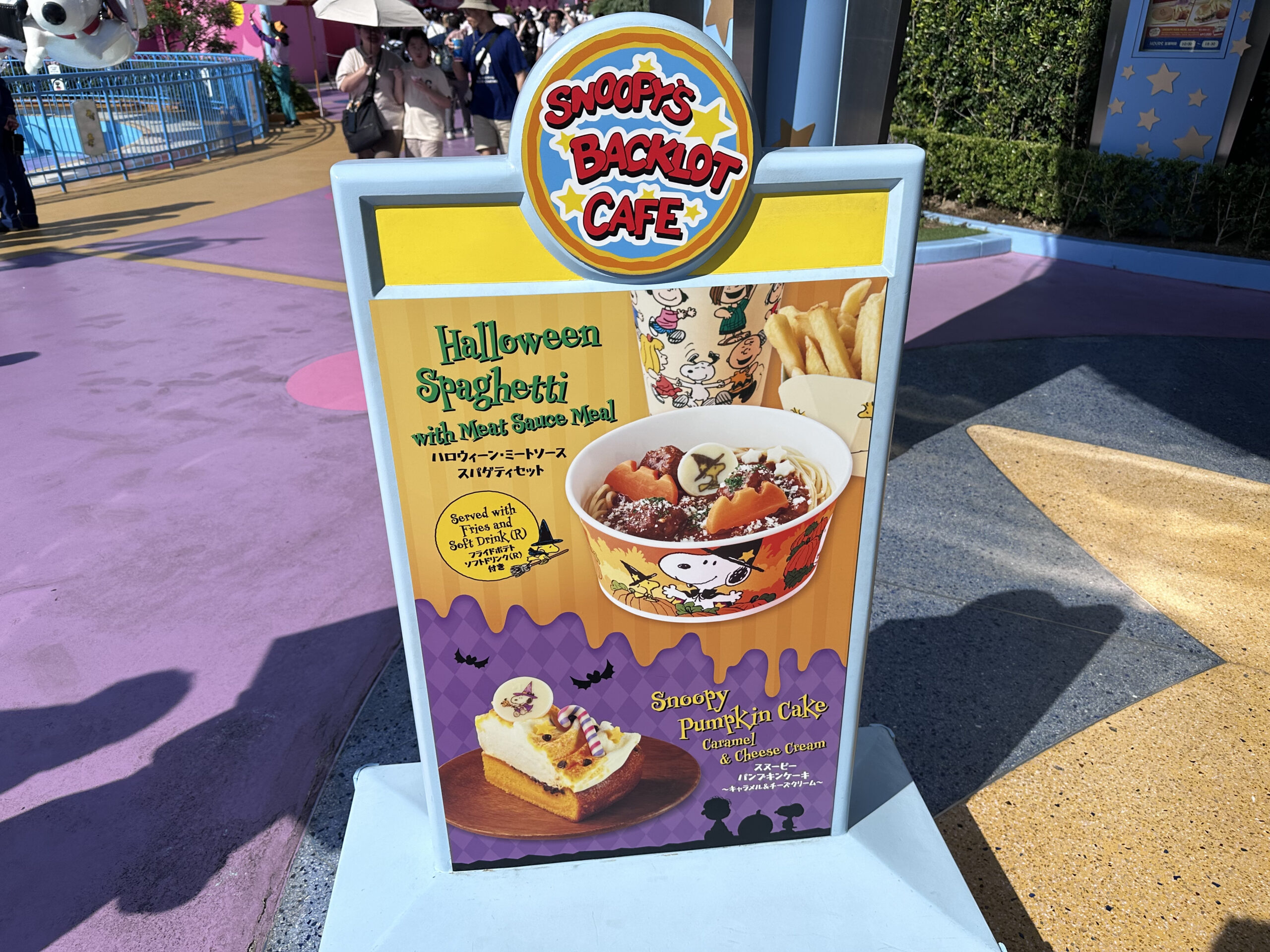 Snoopy’s Backlot Cafe offers Halloween Spaghetti and the Snoopy Pumpkin Cake.