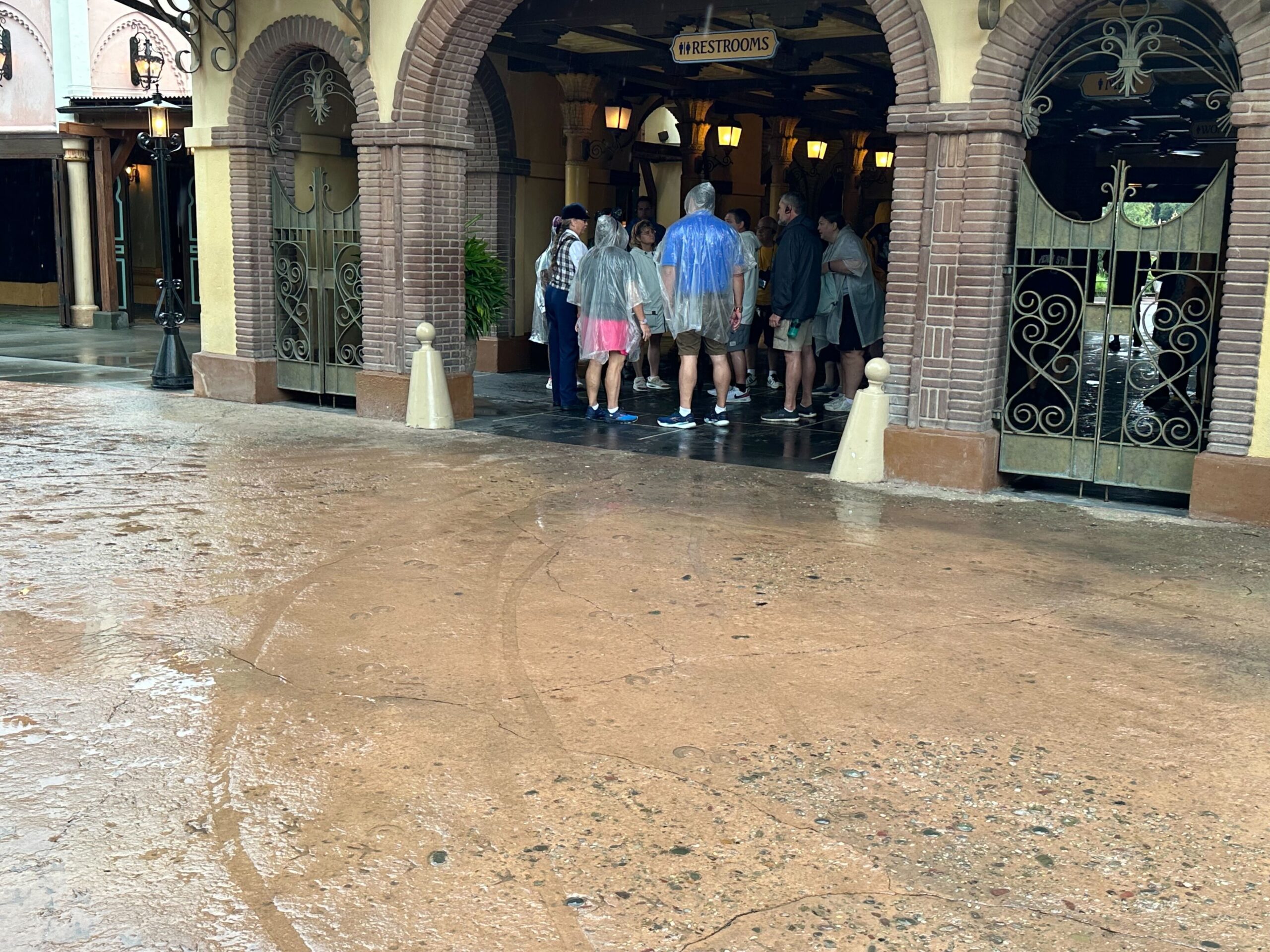 People wearing rain ponchos stand near the restrooms in a theme park area on a rainy day. Wet pavement shows visible tire tracks.