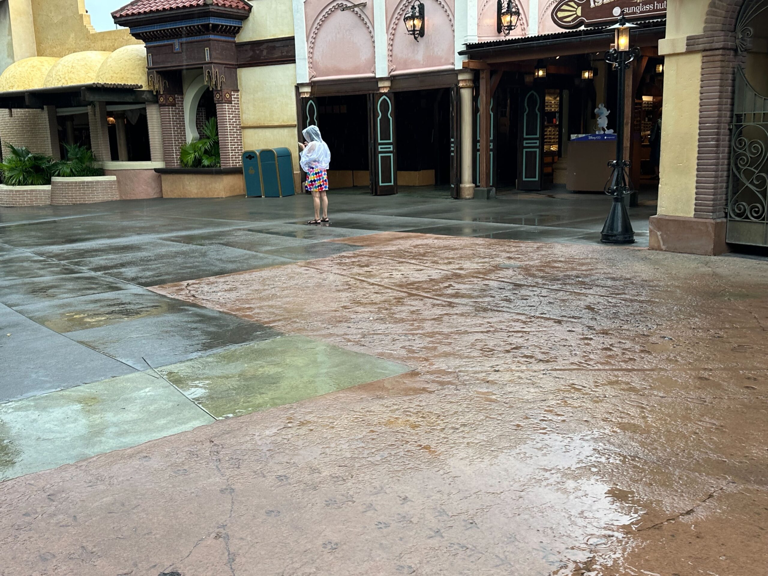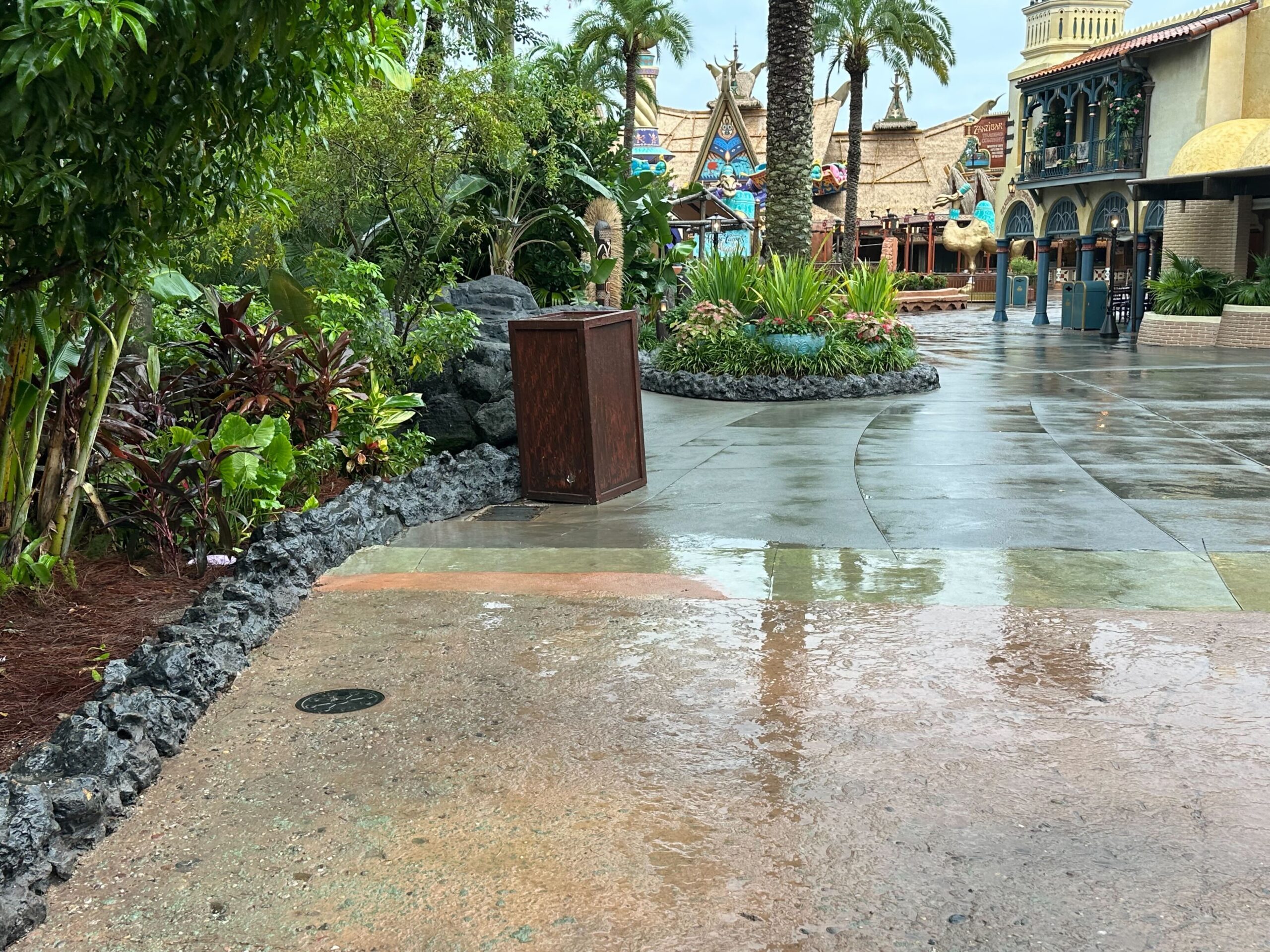 A wet, empty theme park walkway with lush greenery and buildings in the background.