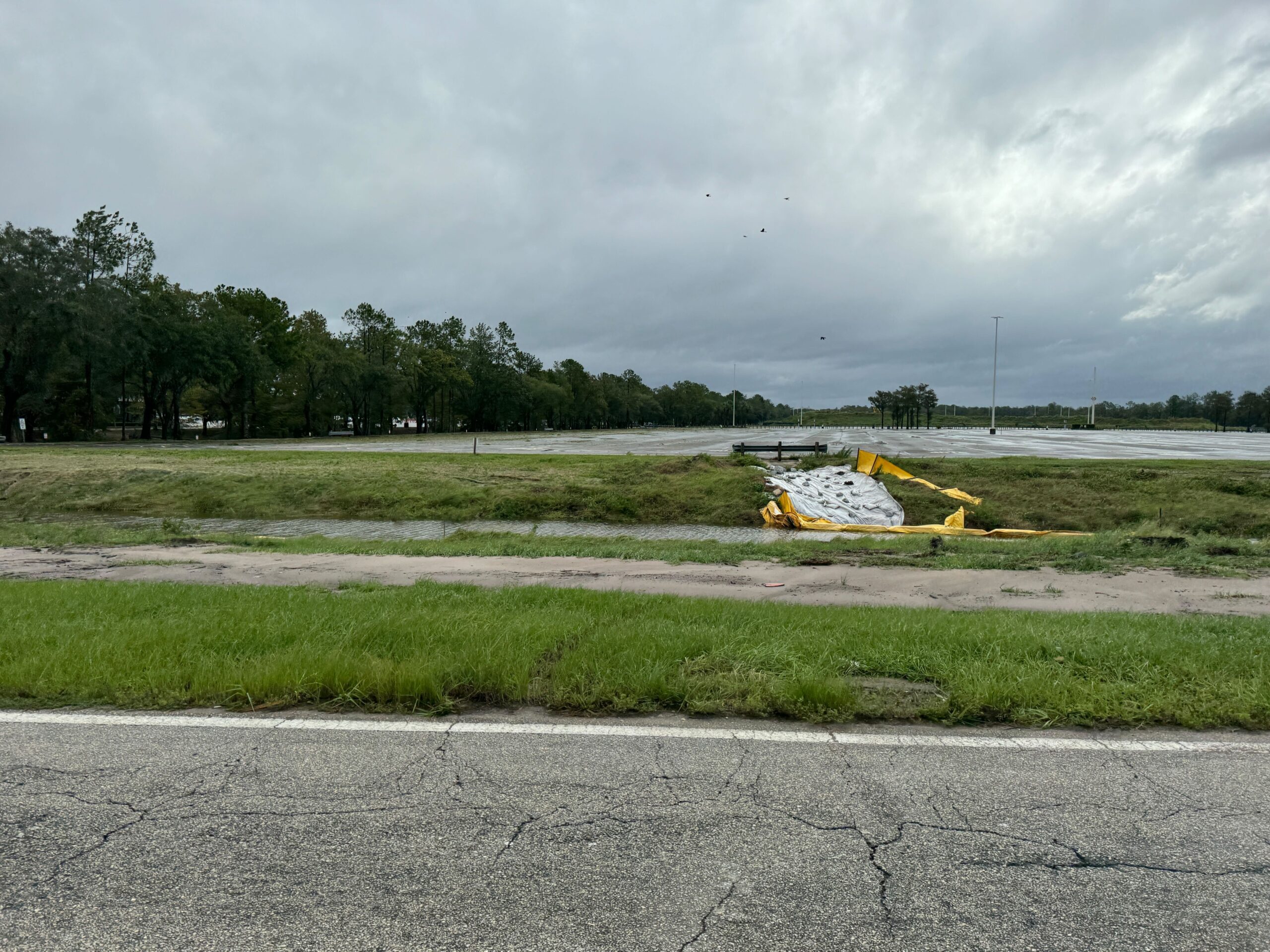 During our drive around property this morning, we noticed a lot of vegetation and downed trees. A few signs were down on World Drive, including a larger one which we saw crews working to restore.
