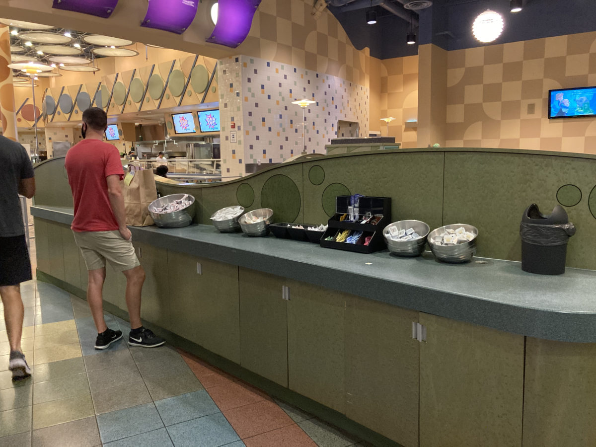 The soda station on the far right has a pattern of Mickey heads on the side facing the windows.