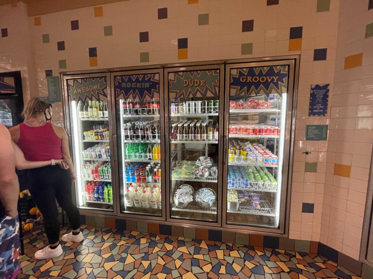 Previously, the ornate tile was also present here, with white and multi-colored tiles on the walls. Each fridge door had a graphic label that didn’t quite say what the items in the sections were, but rather era-based catchphrases, like “dude” and “groovy.” Now, the banners simply say what the items are, from “beverages” to “baked goods.”