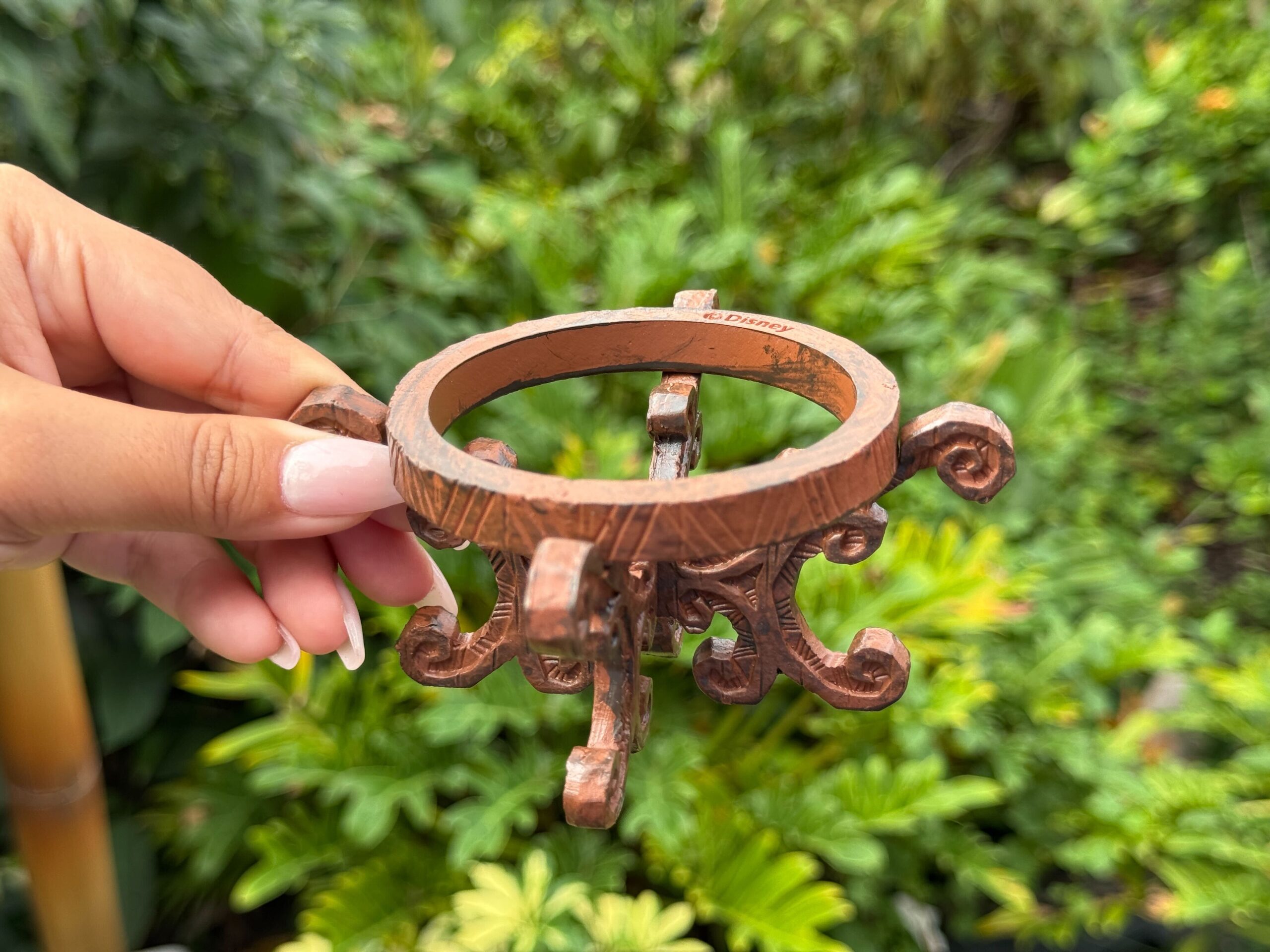 The resin stand is painted and designed to look like wood with carved grain and shades of brown.