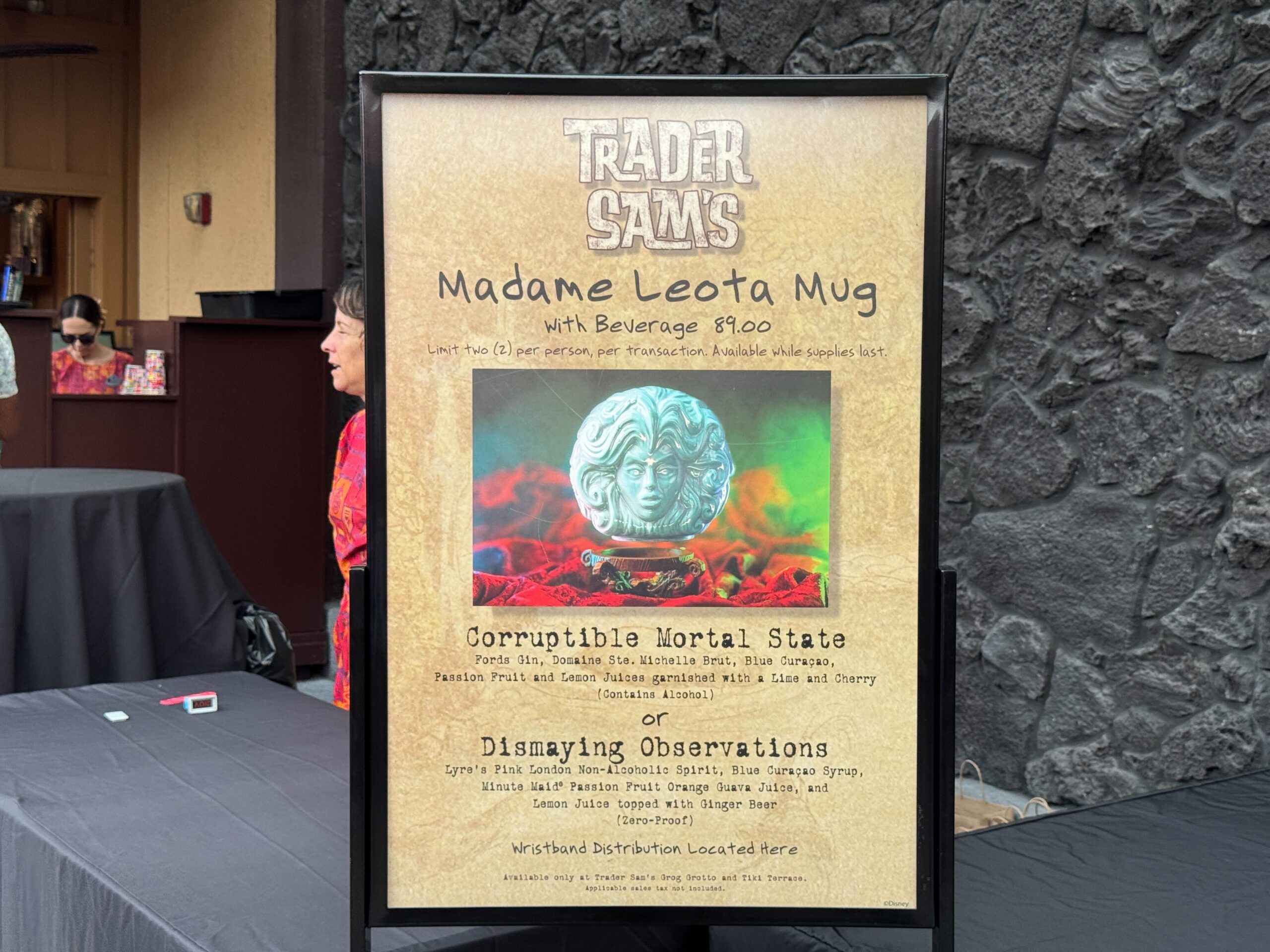 The mug comes with your choice between one of two new Haunted Mansion themed drinks — the zero-proof Dismaying Observations or the alcoholic Corruptible Mortal State. To purchase a mug, guests must get a wristband outside of Grog Grotto.
