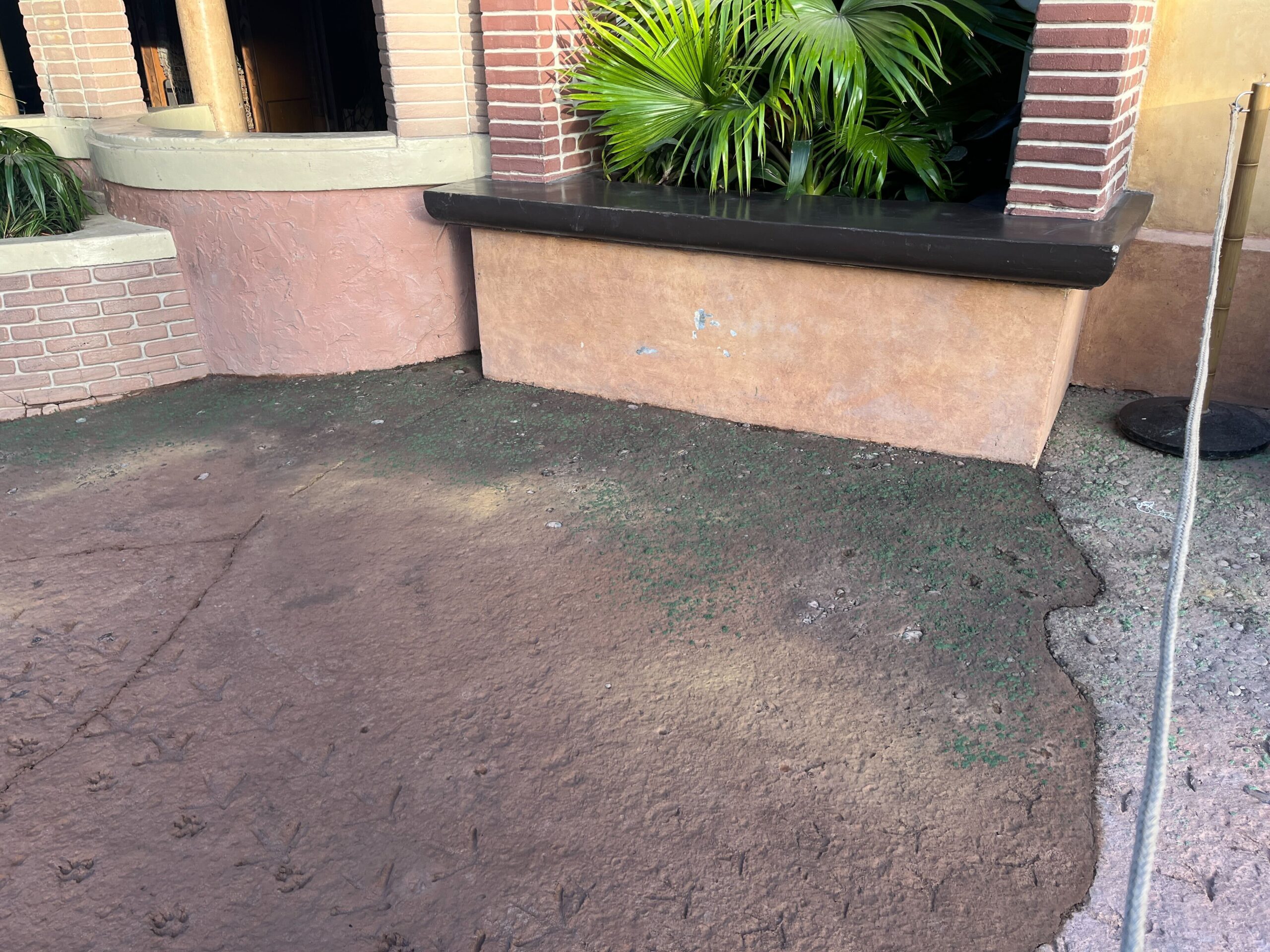 The new Adventureland pavement is light brown like dirt or sand. It’s themed with animal prints and mossy green detailing. The theming is similar to that of pavement in Storybook Circus, Frontierland, and Disney’s Animal Kingdom.