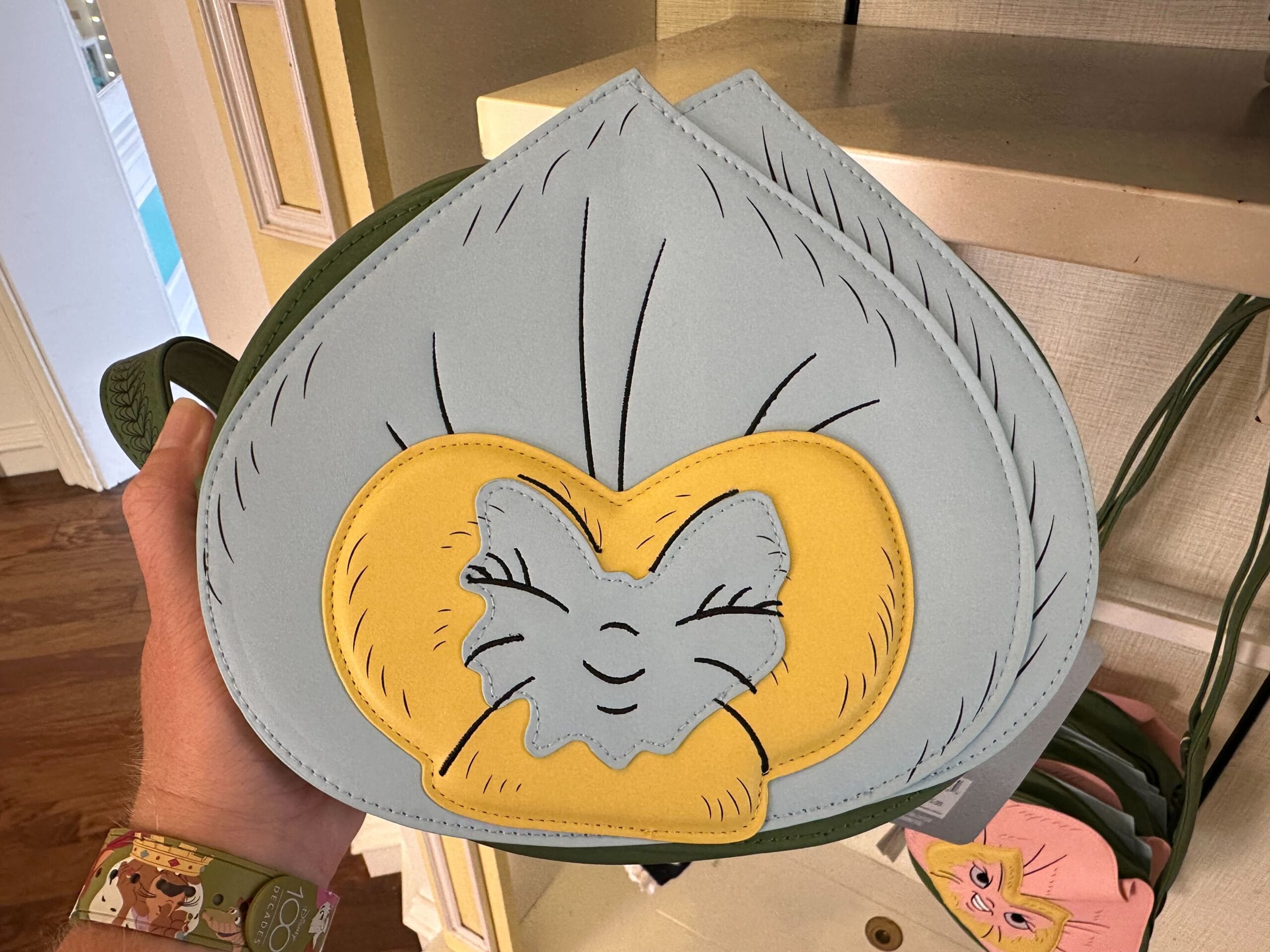 The puffy green bow in the center has the same leaf-like pattern as the purse strap. An enamel Alice charm sits in the center of the bow.