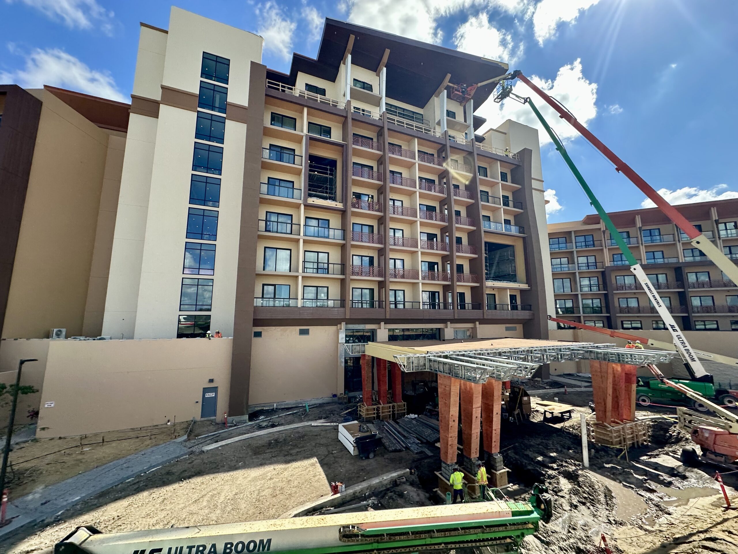 I took the monorail from the Polynesian to go see the new merchandise at the Grand Floridian. On my way, I caught a glimpse of more construction which revealed plywood on the structural supports of the canopy outside the front of the building. The shape certainly feels more Polynesian-inspired.