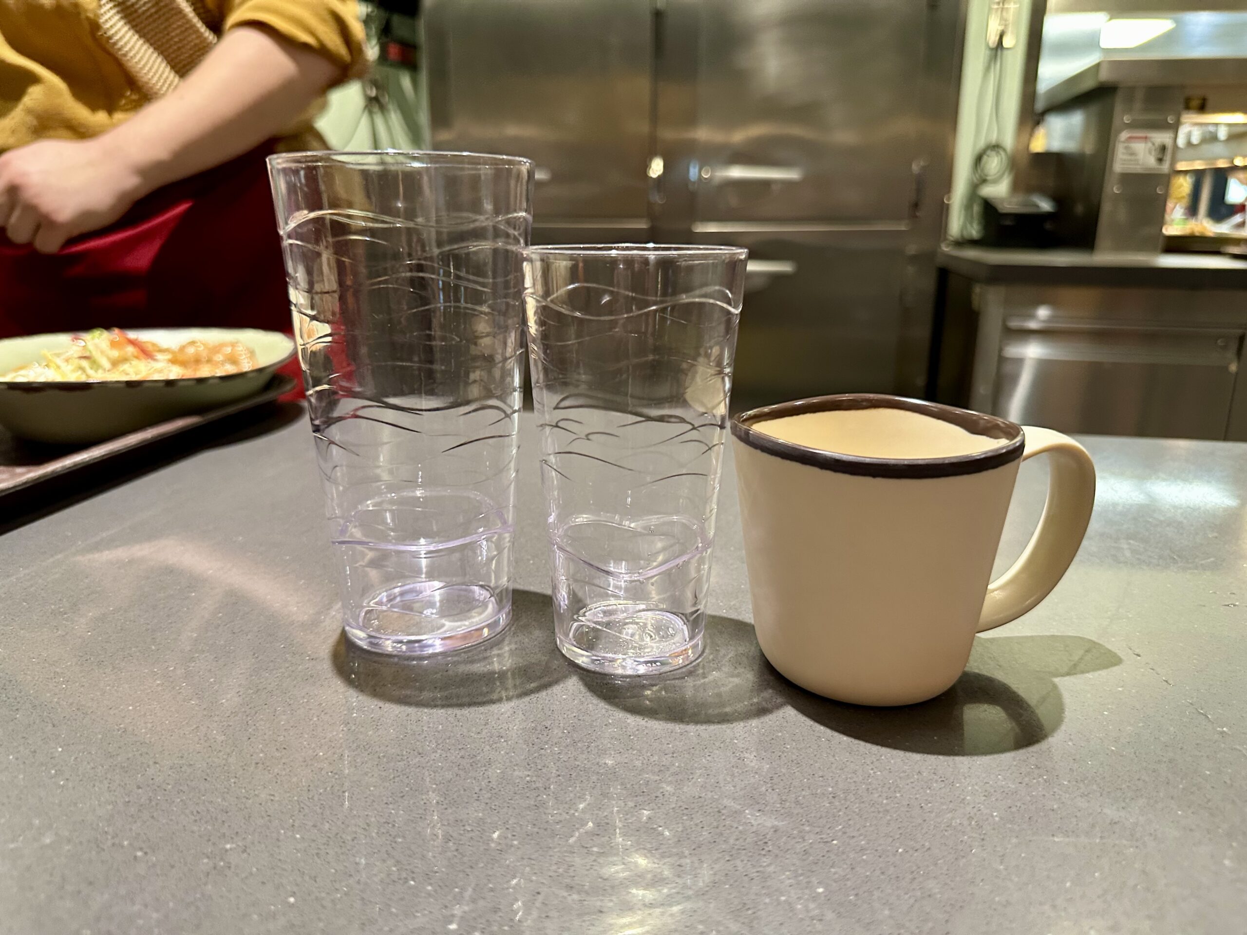 In Satu’li Canteen, I spoke with a very knowledgeable Cast Member who was excited to share that the restaurant is testing new plastic cups that may be coming to Animal Kingdom to help cut down waste. There are two different-sized clear cups and a mug. No, you can’t take these with you, but you can request a to-go plastic cup which is offered upon request.